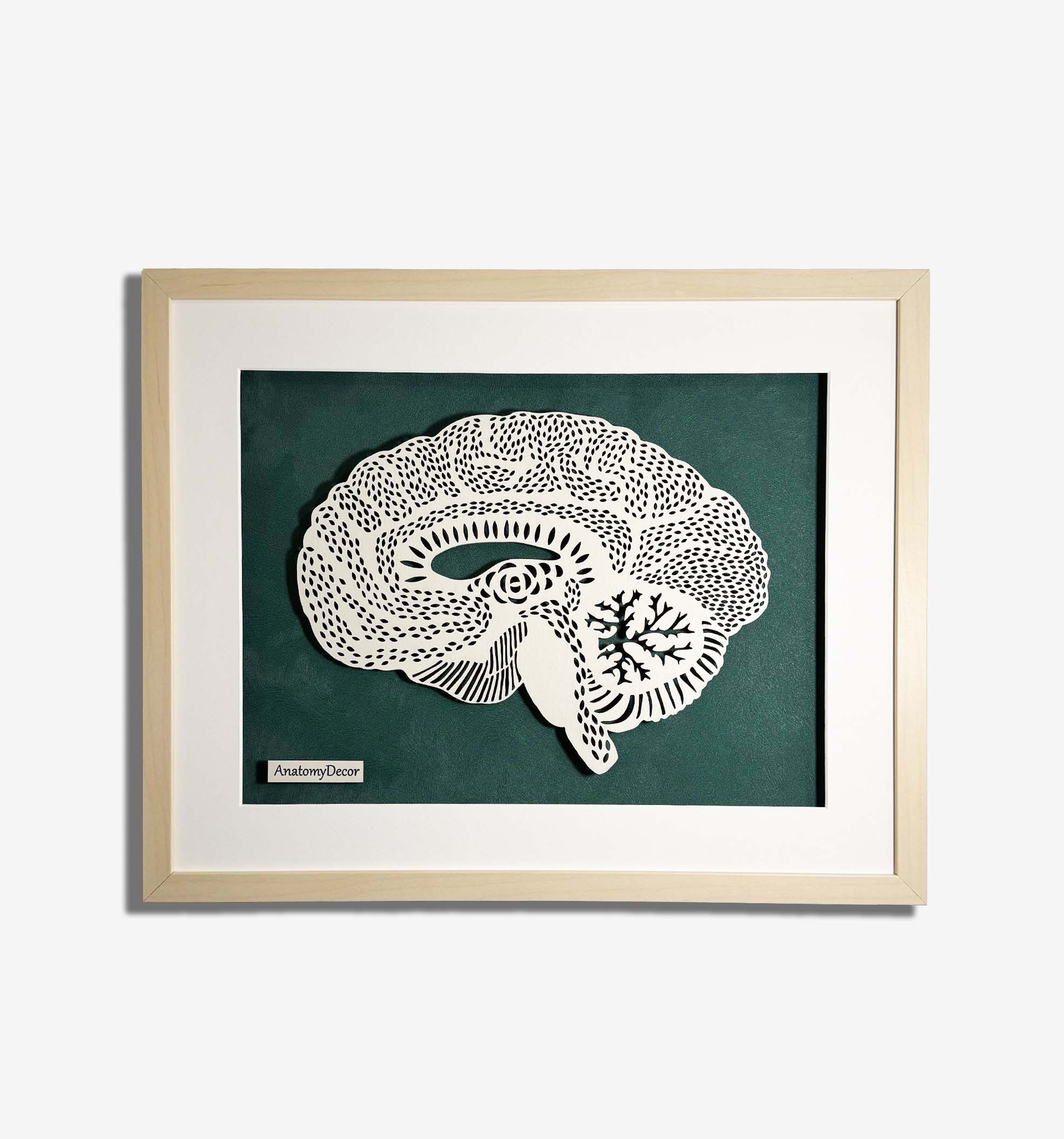 Poznaj nasz wyjątkowy obraz przedstawiający drewniany mózg w subtelnym kremowym odcieniu, umieszczony na eleganckim płótnie w kolorze butelkowej zieleni. Całość została oprawiona w stylową drewnianą ramę z Passe Partout wraz nietłukącą szybą z pleksi, która zapewnia trwałość i bezpieczeństwo.