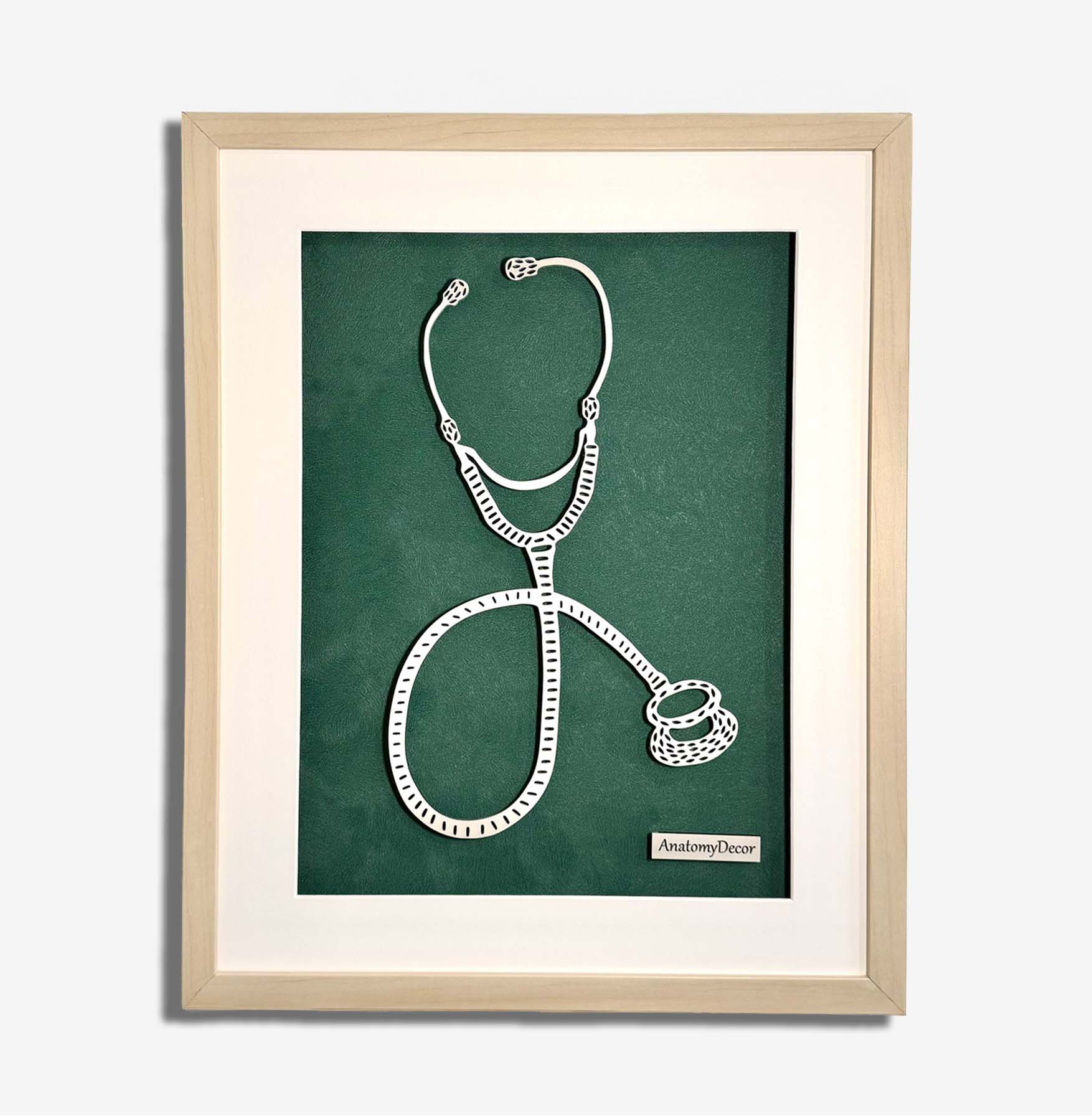 Poznaj nasz wyjątkowy obraz przedstawiający drewniany stetoskop w subtelnym kremowym odcieniu, umieszczony na eleganckim płótnie w kolorze butelkowej zieleni. Całość została oprawiona w stylową drewnianą ramę z Passe Partout wraz nietłukącą szybą z pleksi, która zapewnia trwałość i bezpieczeństwo.