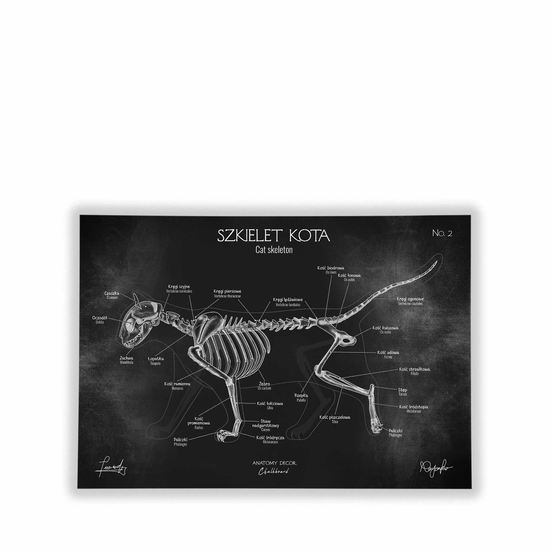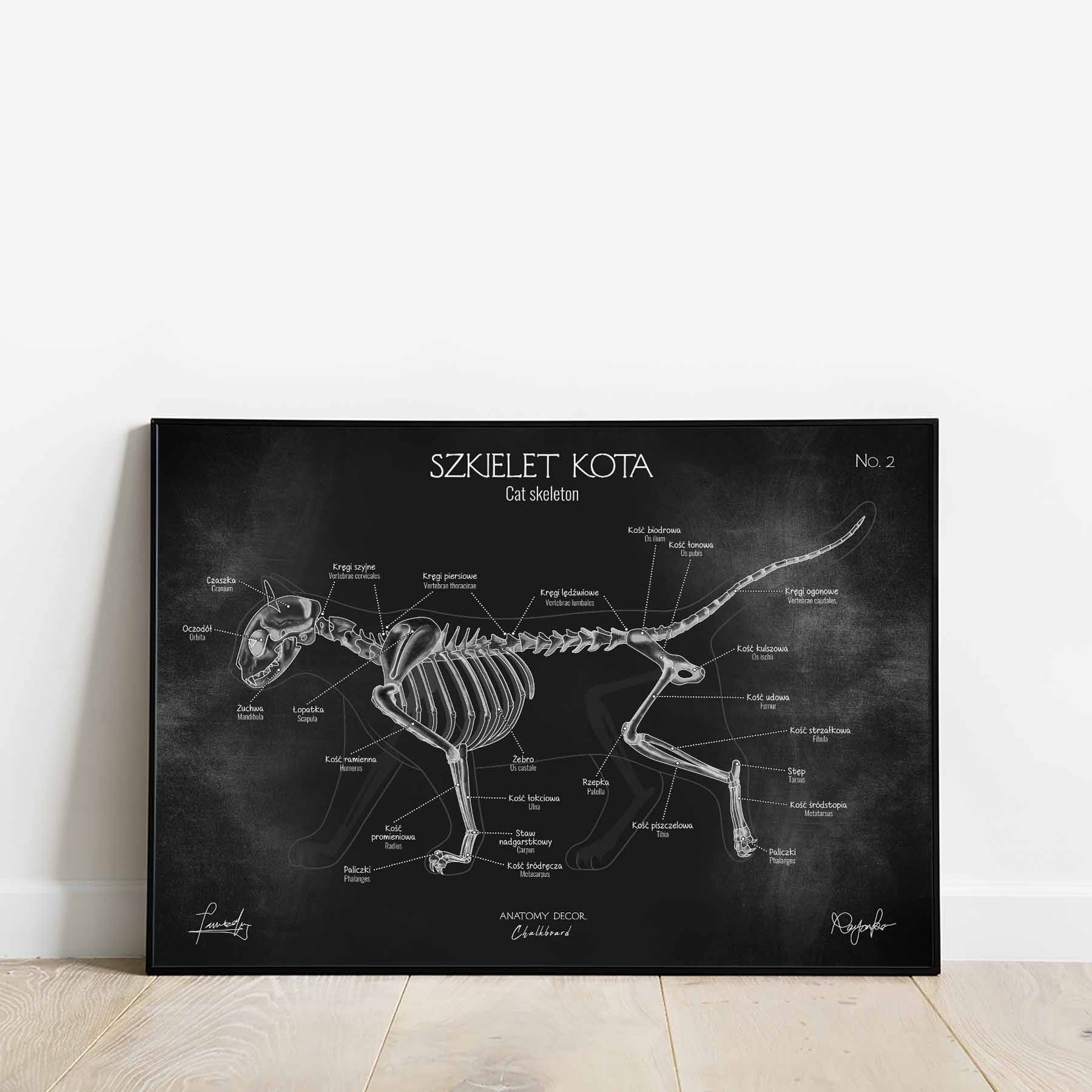 Plakat przedstawia poprawny anatomicznie szkielet kota z nomenklaturą w języku polskim i łacińskim na tle kredowej tablicy. Łącząc w sobie elementy nauki i sztuki, staje się nie tylko źródłem wiedzy, ale również ciekawą ozdobą wnętrz.