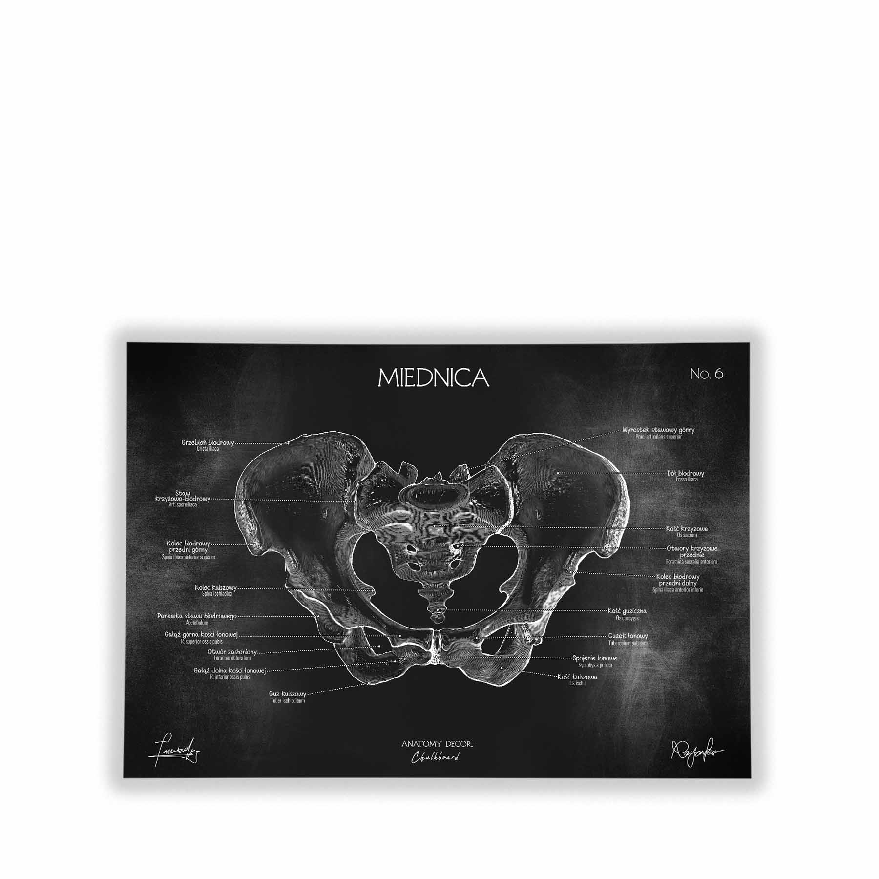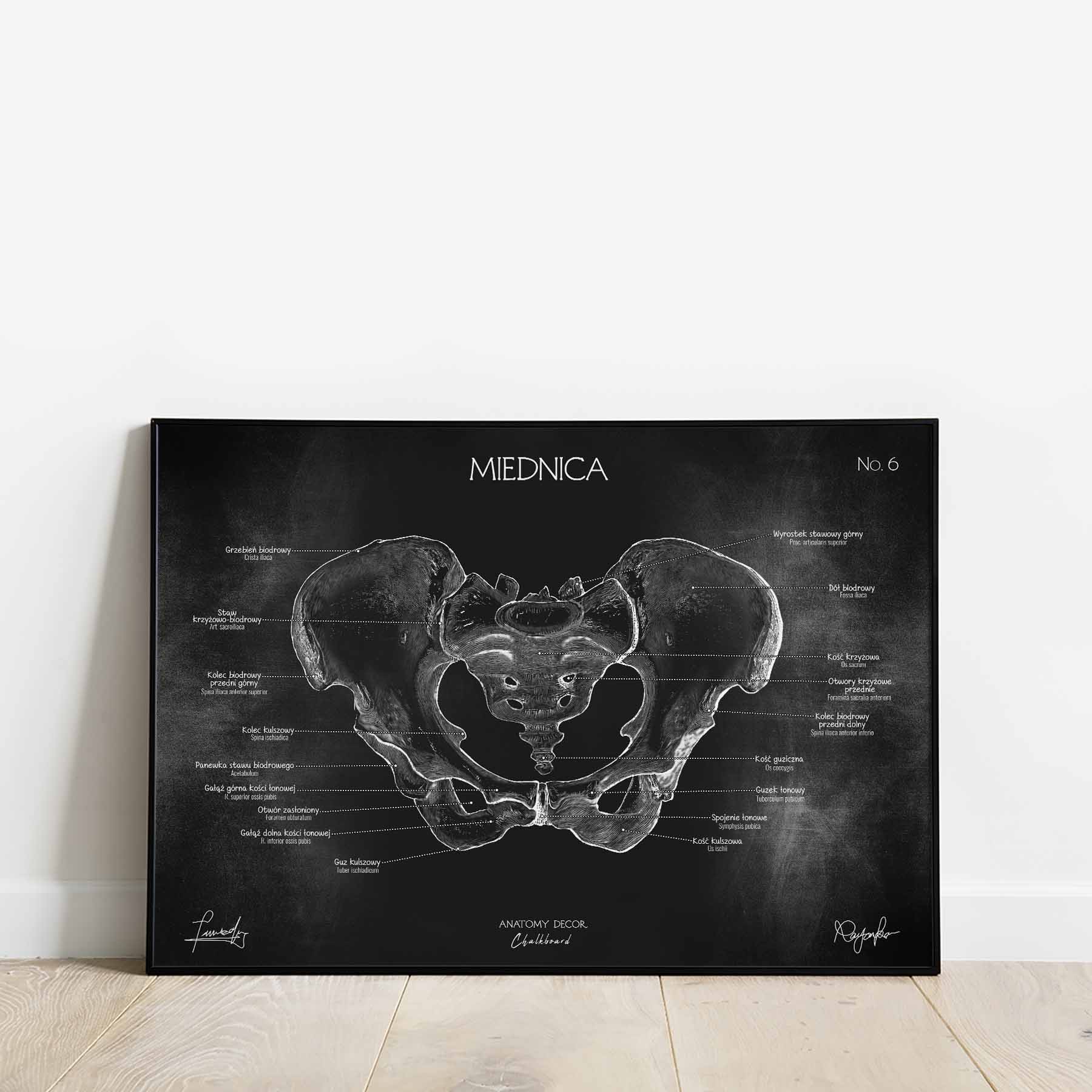 Plansza przedstawia poprawny anatomicznie rysunek miednicy z nomenklaturą w języku polskim i łacińskim na tle kredowej tablicy. Łącząc w sobie elementy nauki i sztuki, staje się nie tylko źródłem wiedzy, ale również ciekawą ozdobą wnętrz.