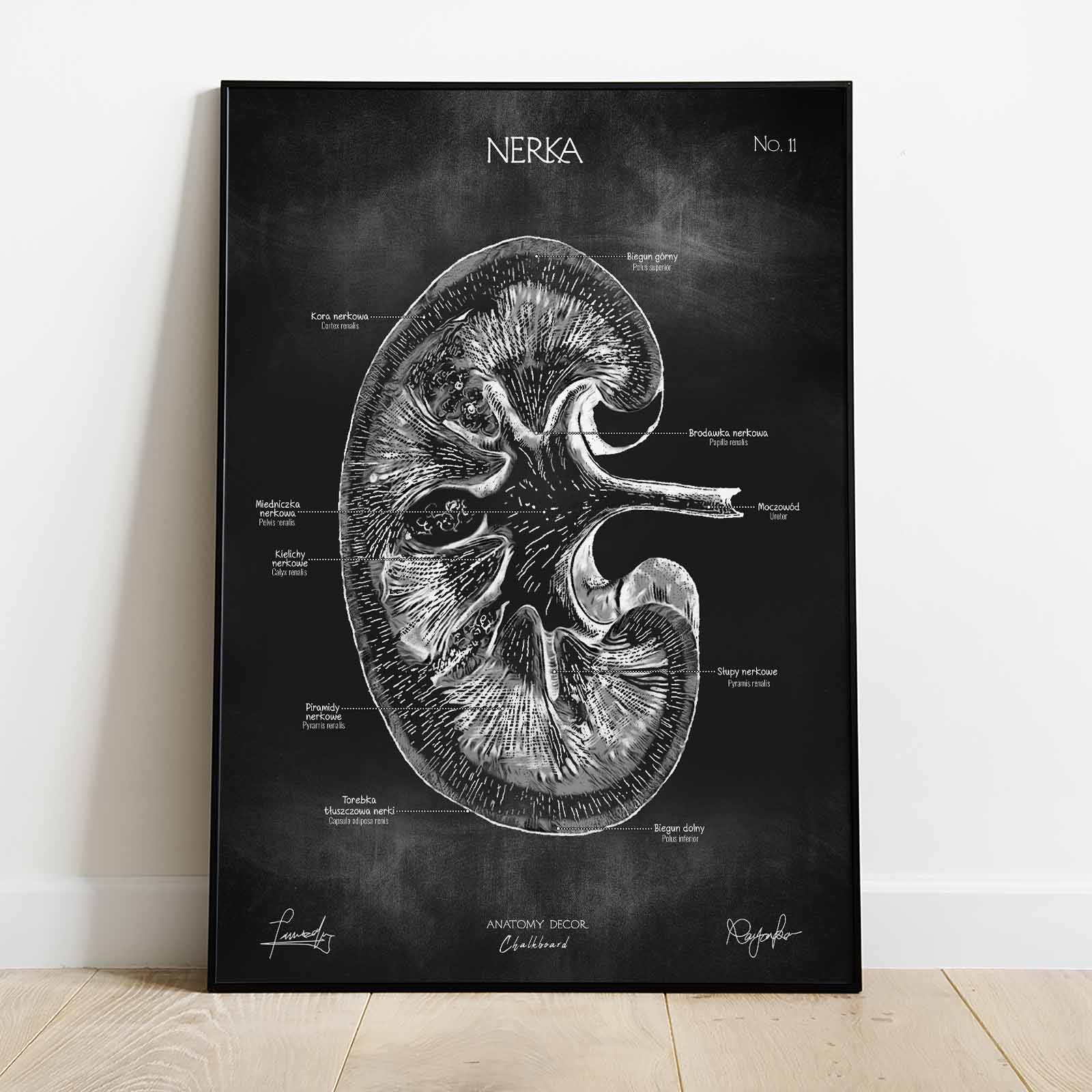 Plansza przedstawia poprawny anatomicznie rysunek nerki z nomenklaturą w języku polskim i łacińskim na tle kredowej tablicy. Łącząc w sobie elementy nauki i sztuki, staje się nie tylko źródłem wiedzy, ale również ciekawą ozdobą wnętrz.