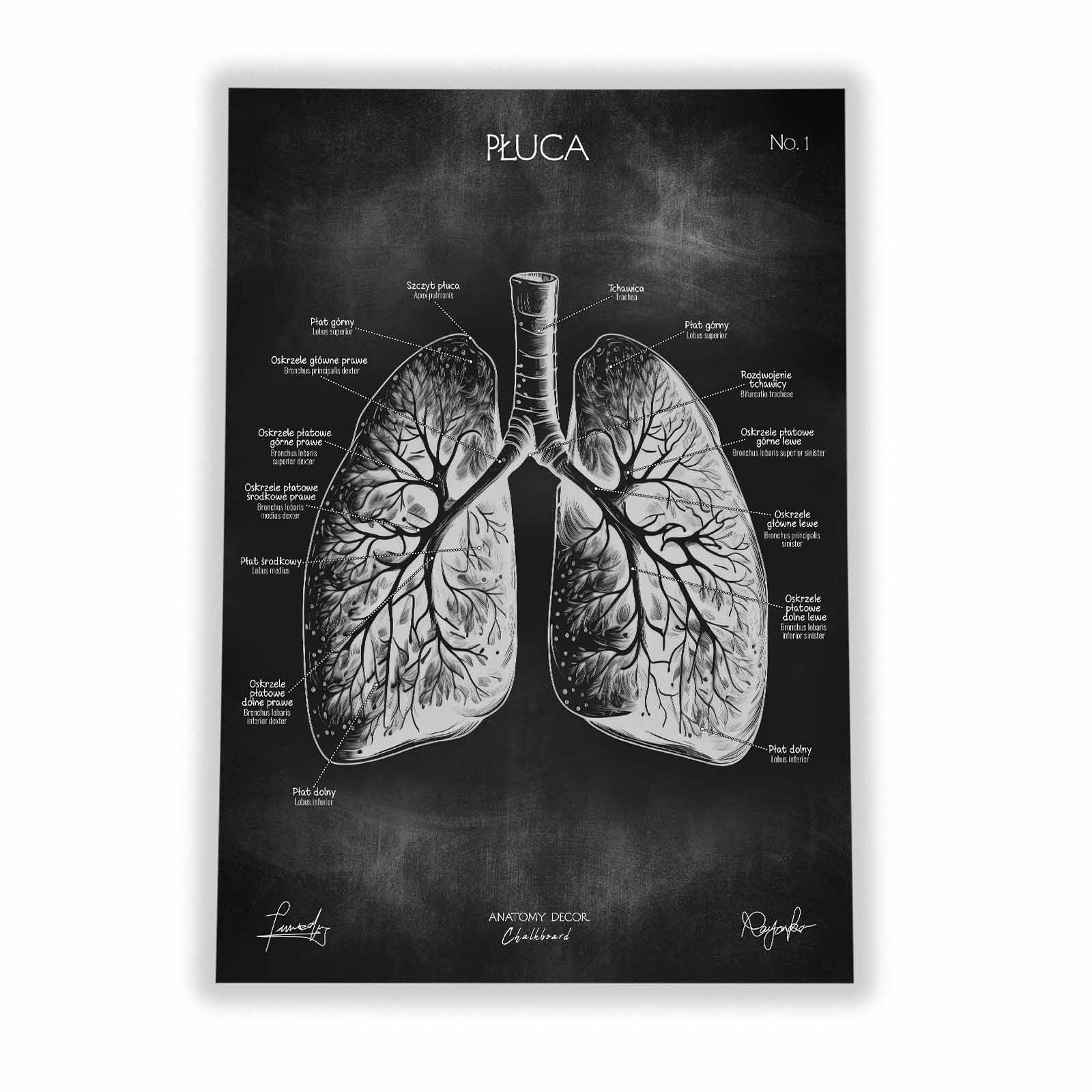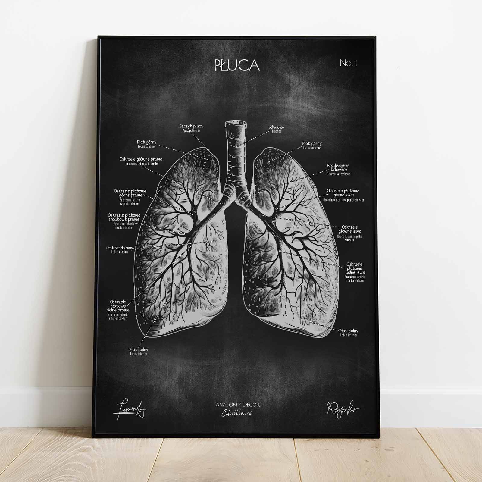 Plansza przedstawia poprawny anatomicznie rysunek płuc z nomenklaturą w języku polskim i łacińskim na tle kredowej tablicy. Łącząc w sobie elementy nauki i sztuki, staje się nie tylko źródłem wiedzy, ale również ciekawą ozdobą wnętrz.
