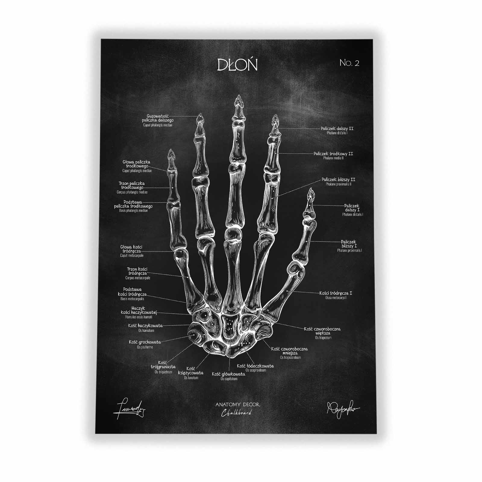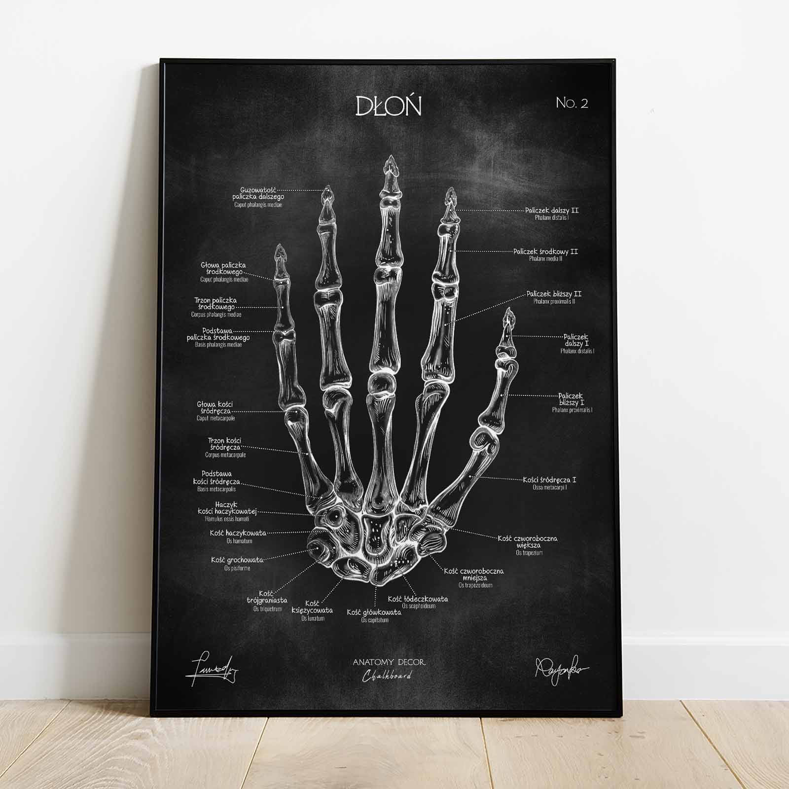 Plansza przedstawia poprawny anatomicznie rysunek ręki z nomenklaturą w języku polskim i  łacińskim na tle kredowej tablicy. Łącząc w sobie elementy nauki i sztuki, staje się nie tylko źródłem wiedzy, ale również ciekawą ozdobą wnętrz.