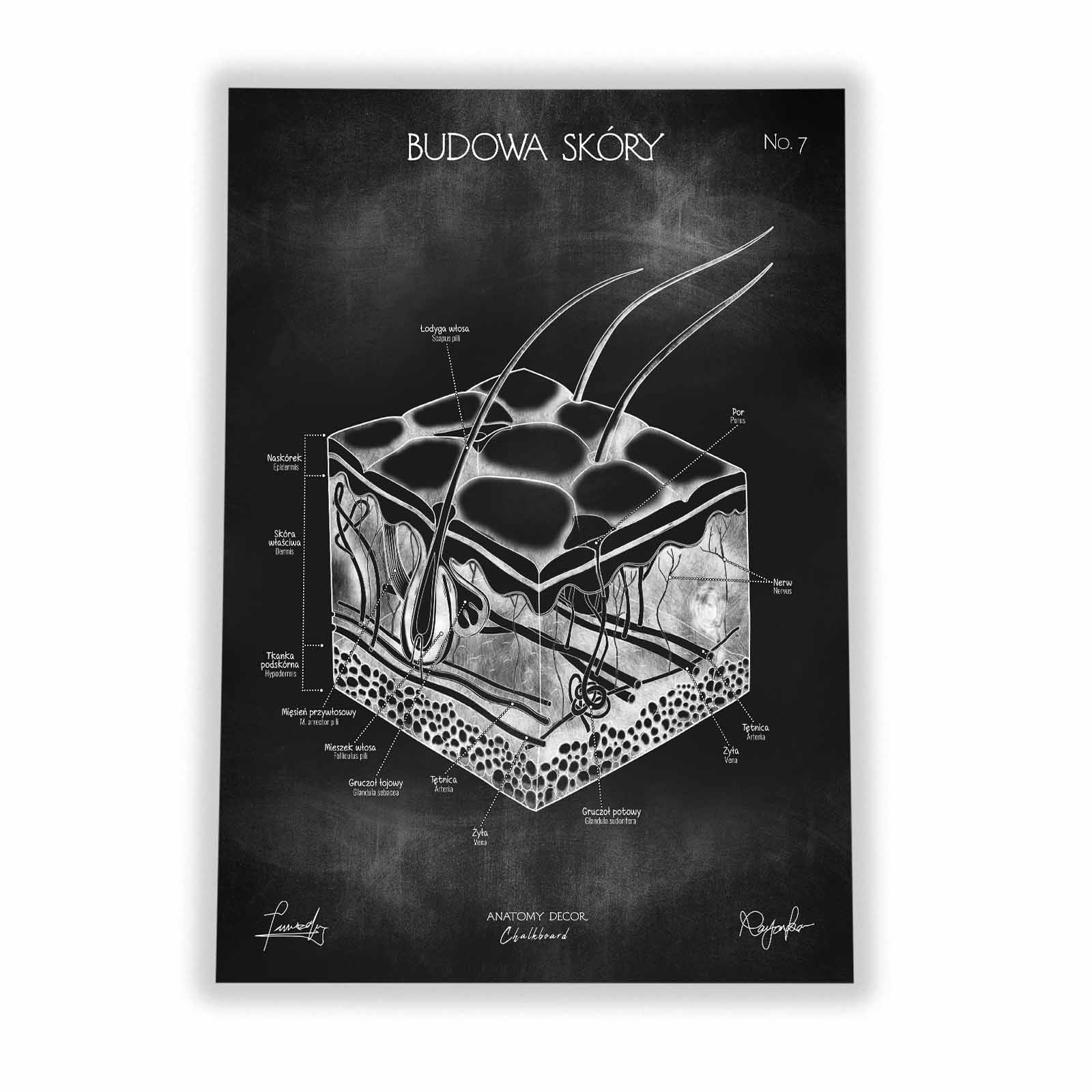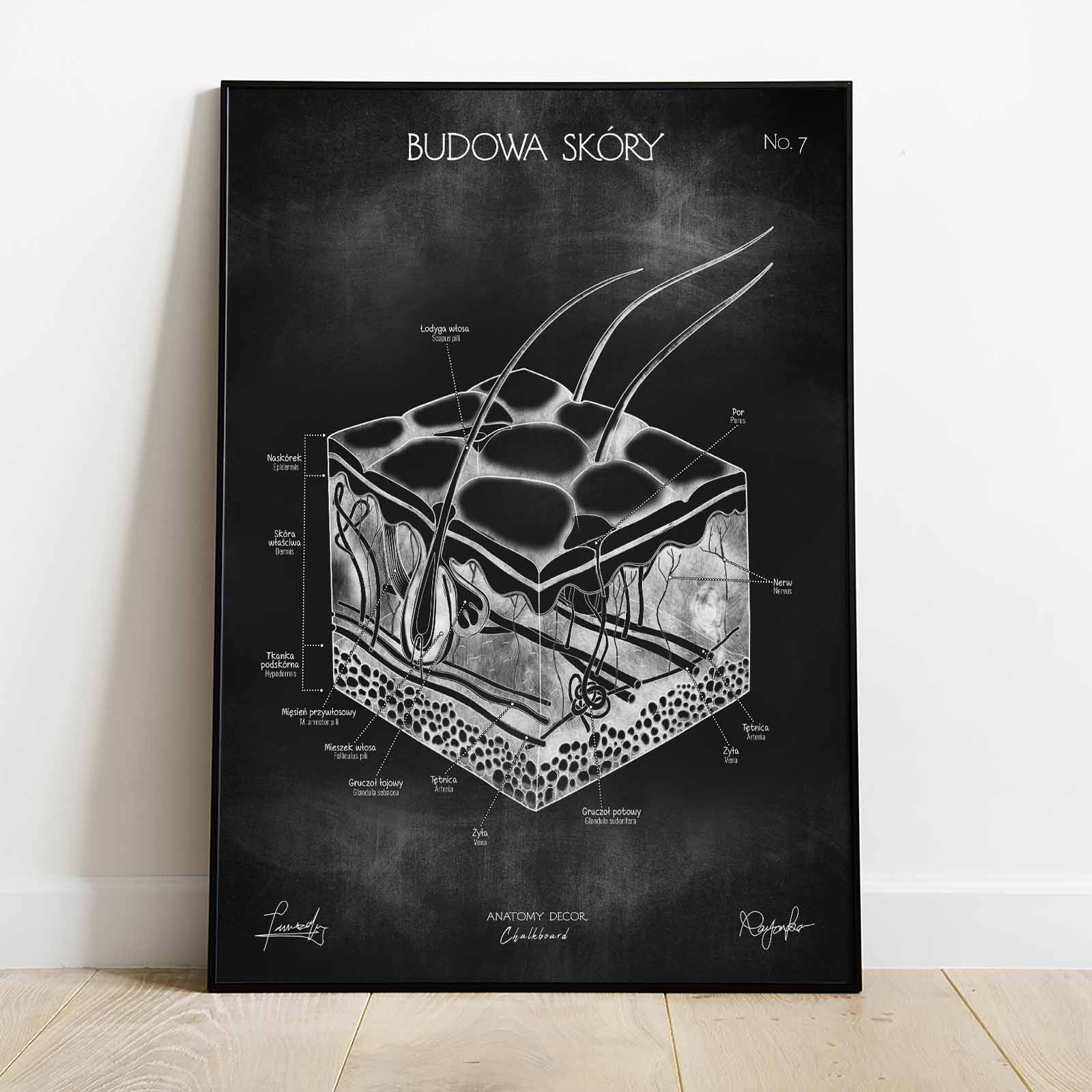 Plansza przedstawia poprawny anatomicznie rysunek skóry z nomenklaturą w języku polskim i łacińskim na tle kredowej tablicy. Łącząc w sobie elementy nauki i sztuki, staje się nie tylko źródłem wiedzy, ale również ciekawą ozdobą wnętrz.