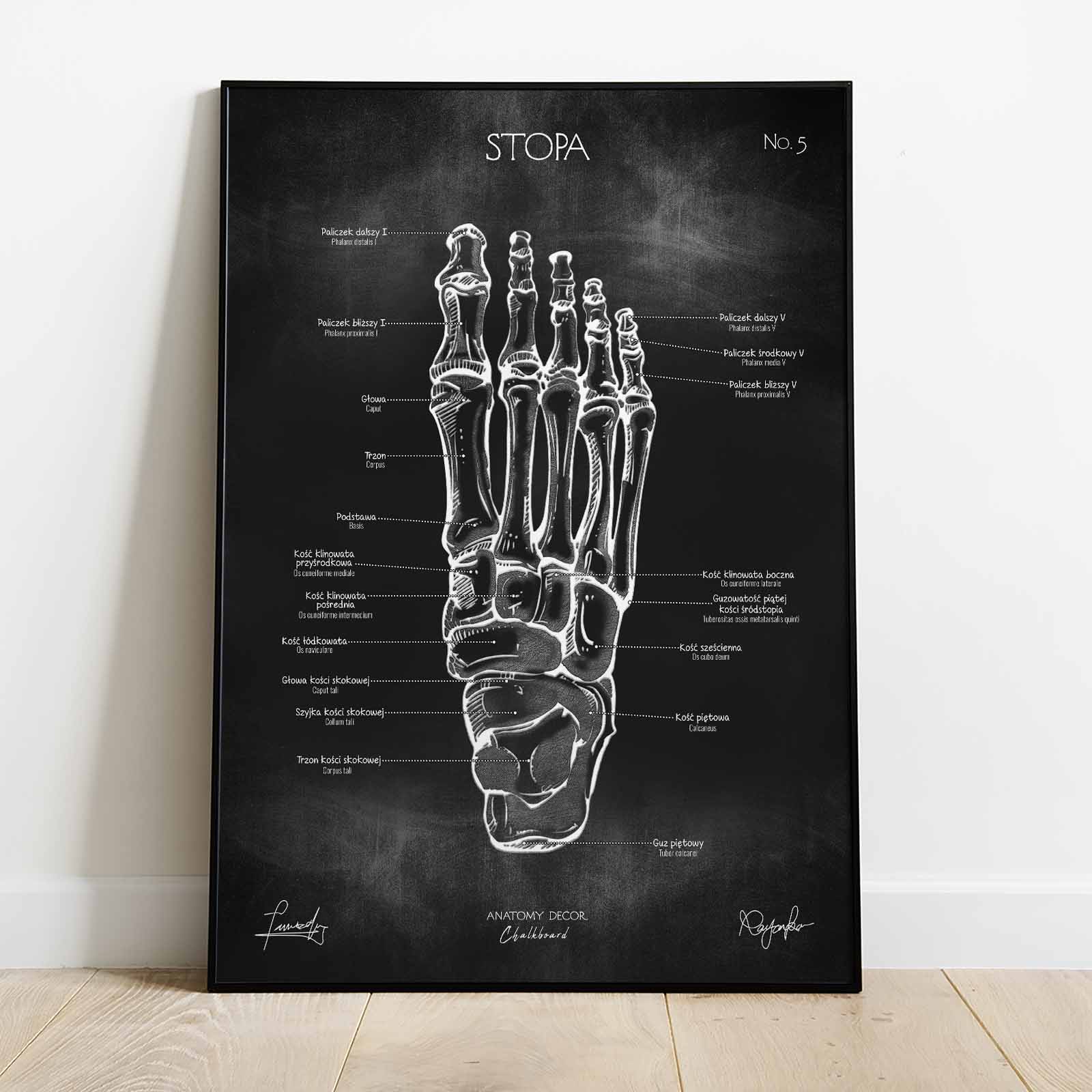 Plansza przedstawia poprawny anatomicznie rysunek stopy z nomenklaturą w języku polskim i łacińskim na tle kredowej tablicy. Łącząc w sobie elementy nauki i sztuki, staje się nie tylko źródłem wiedzy, ale również ciekawą ozdobą wnętrz.