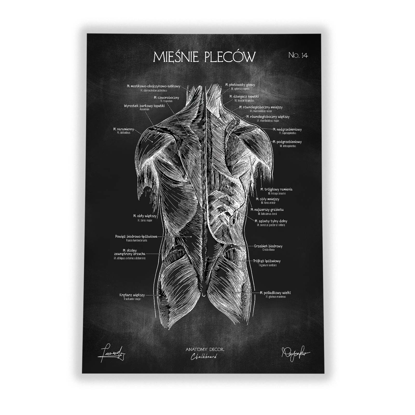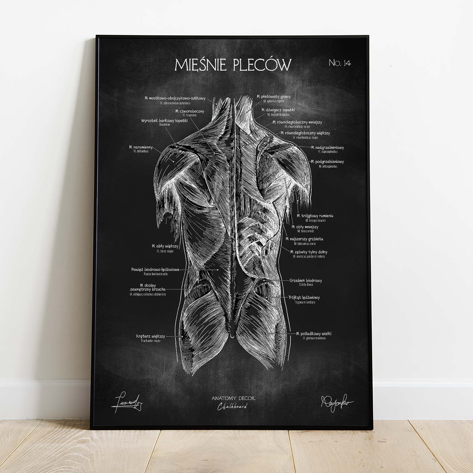 Plansza przedstawia poprawny anatomicznie rysunek mięśni tylnej ściany tułowia z nomenklaturą w języku polskim i łacińskim na tle kredowej tablicy. Łącząc w sobie elementy nauki i sztuki, staje się nie tylko źródłem wiedzy, ale również ciekawą ozdobą wnętrz.