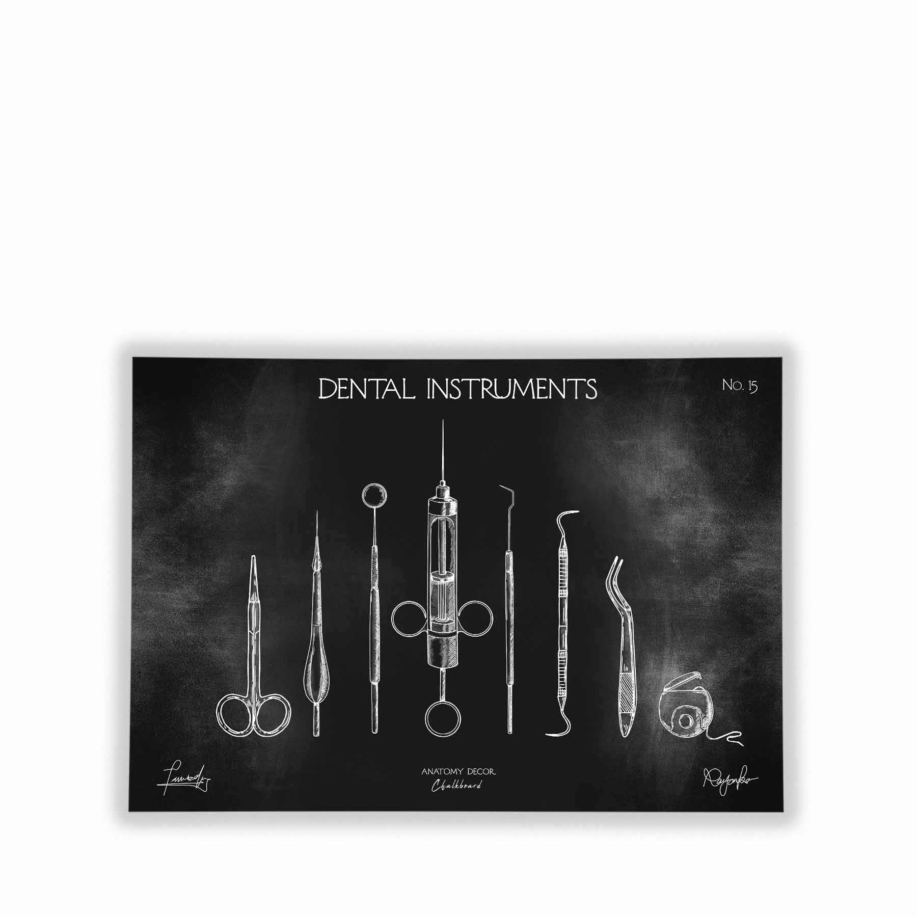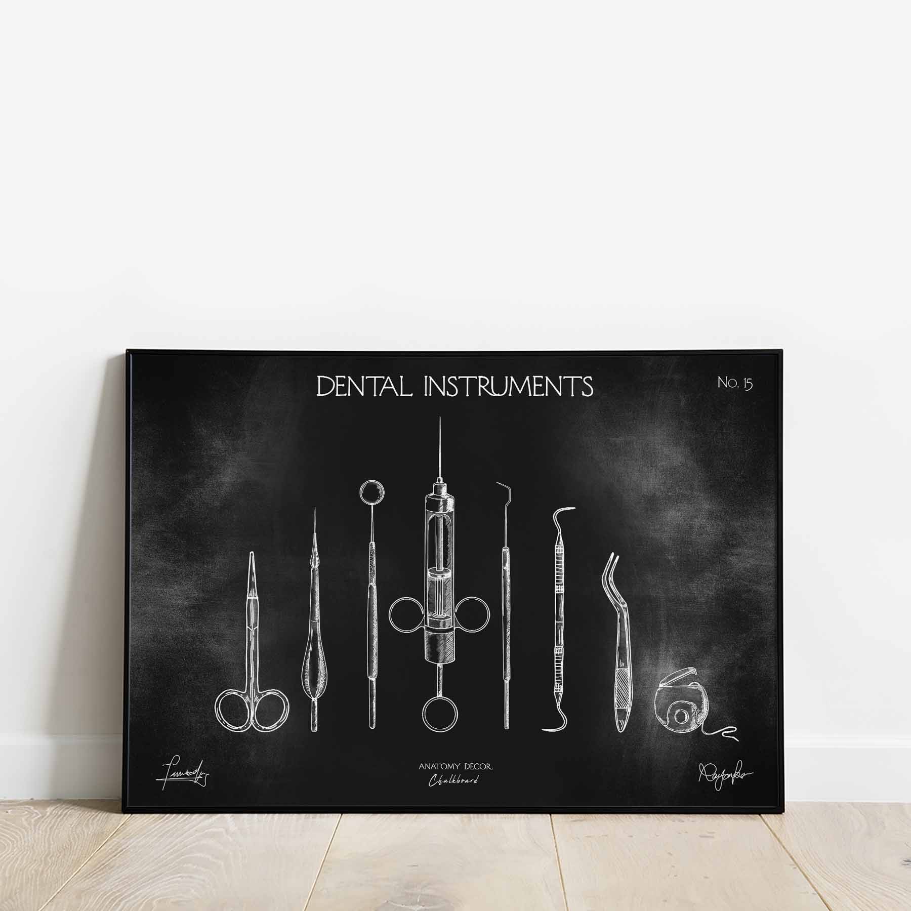 Plansza przedstawia narzędzia dentystyczne na tle kredowej tablicy. Łącząc w sobie elementy nauki i sztuki, staje się nie tylko źródłem wiedzy, ale również ciekawą ozdobą wnętrz.