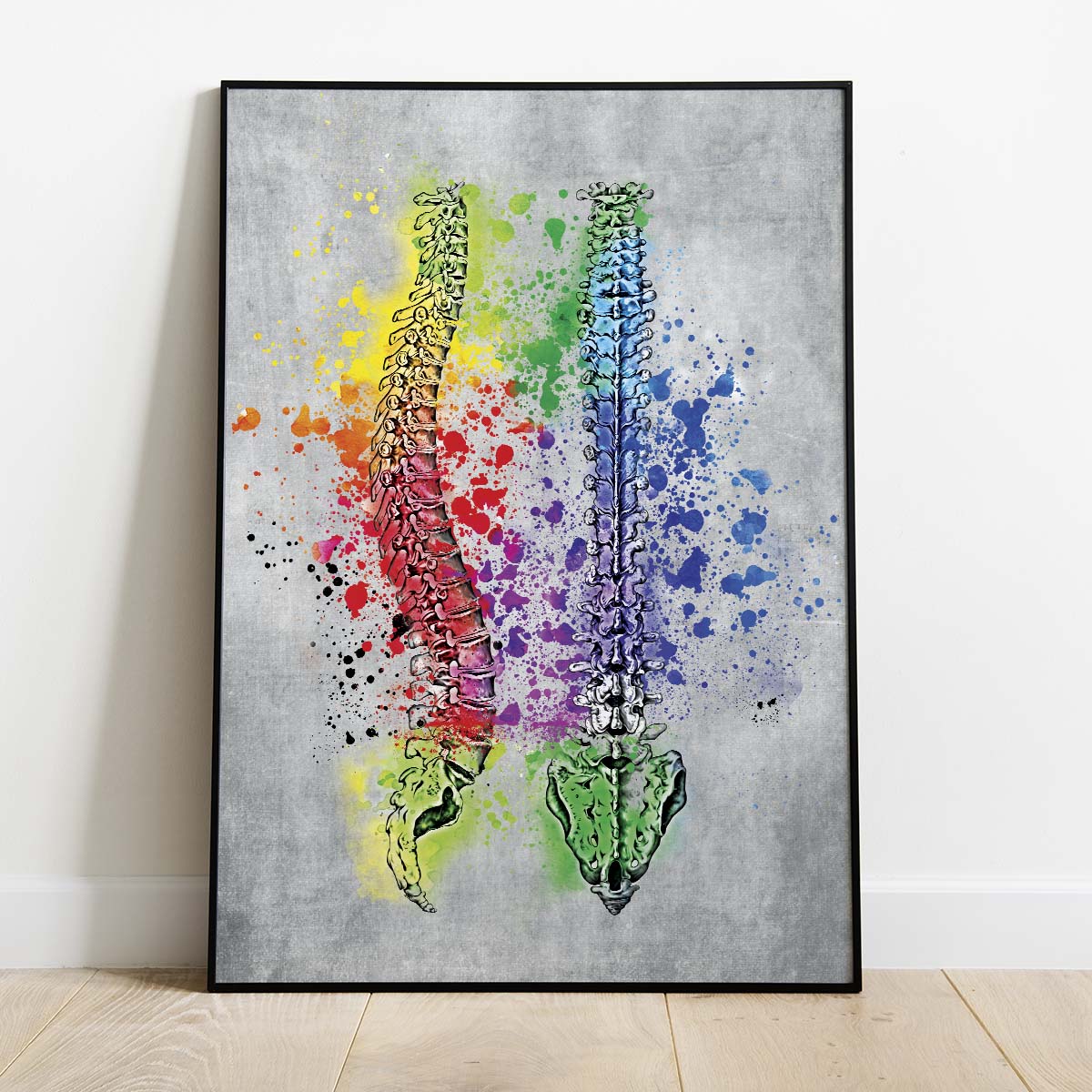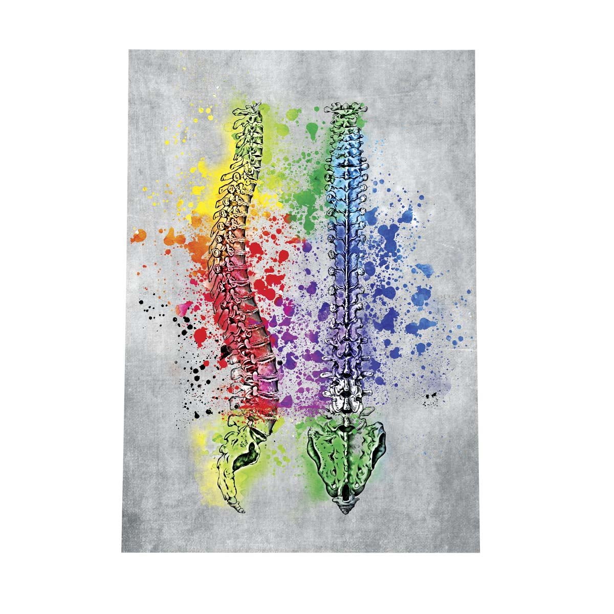 Plakat przedstawia kręgosłup anatomiczny w kolorach na szarym tle.