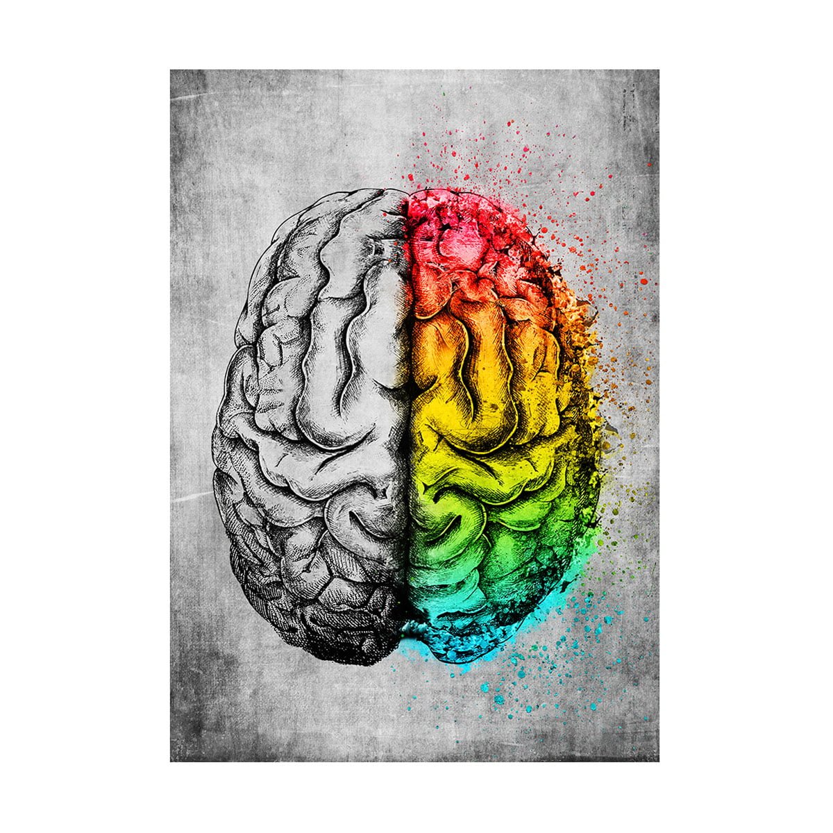 Grafika przedstawia mózg anatomiczny w kolorach na szarym tle.