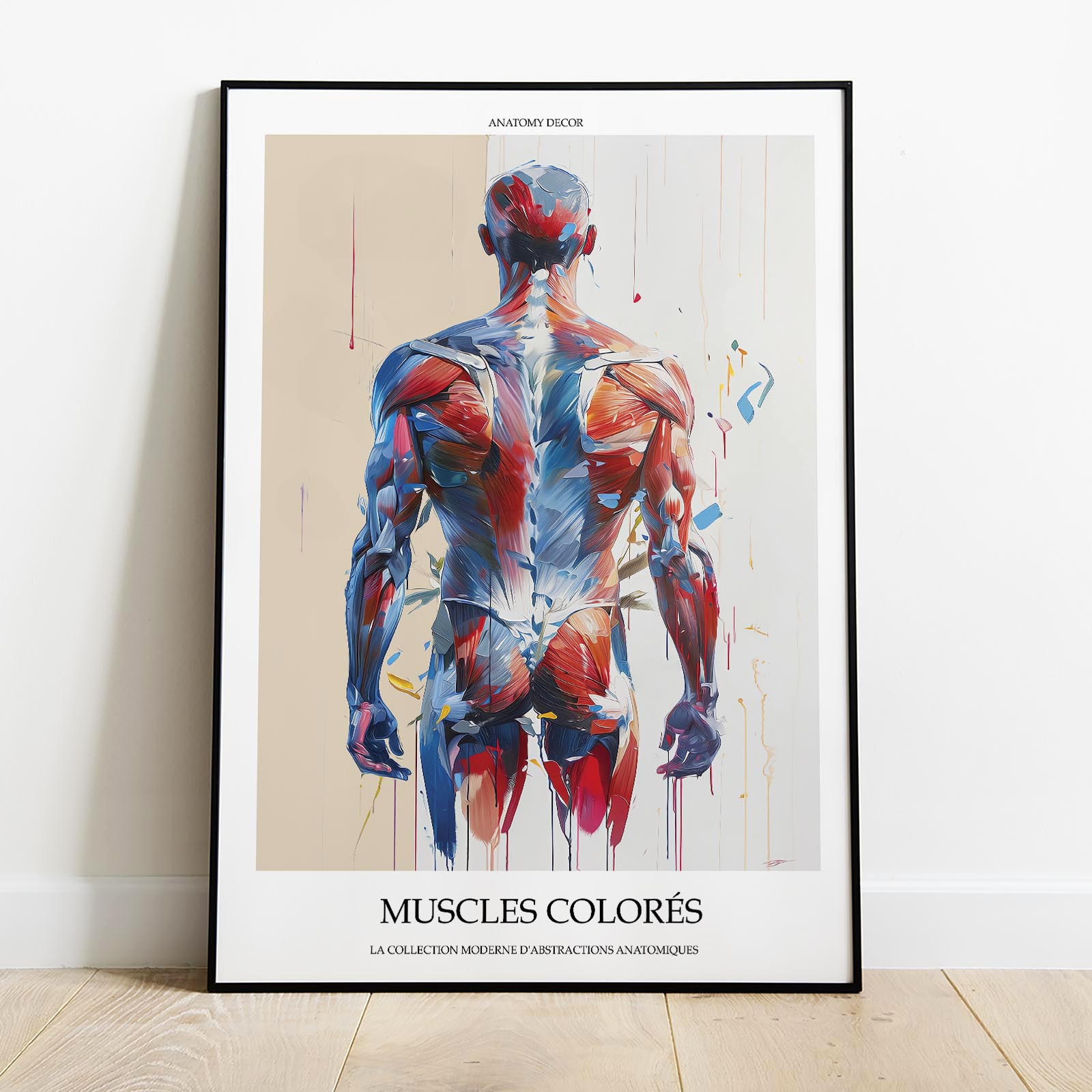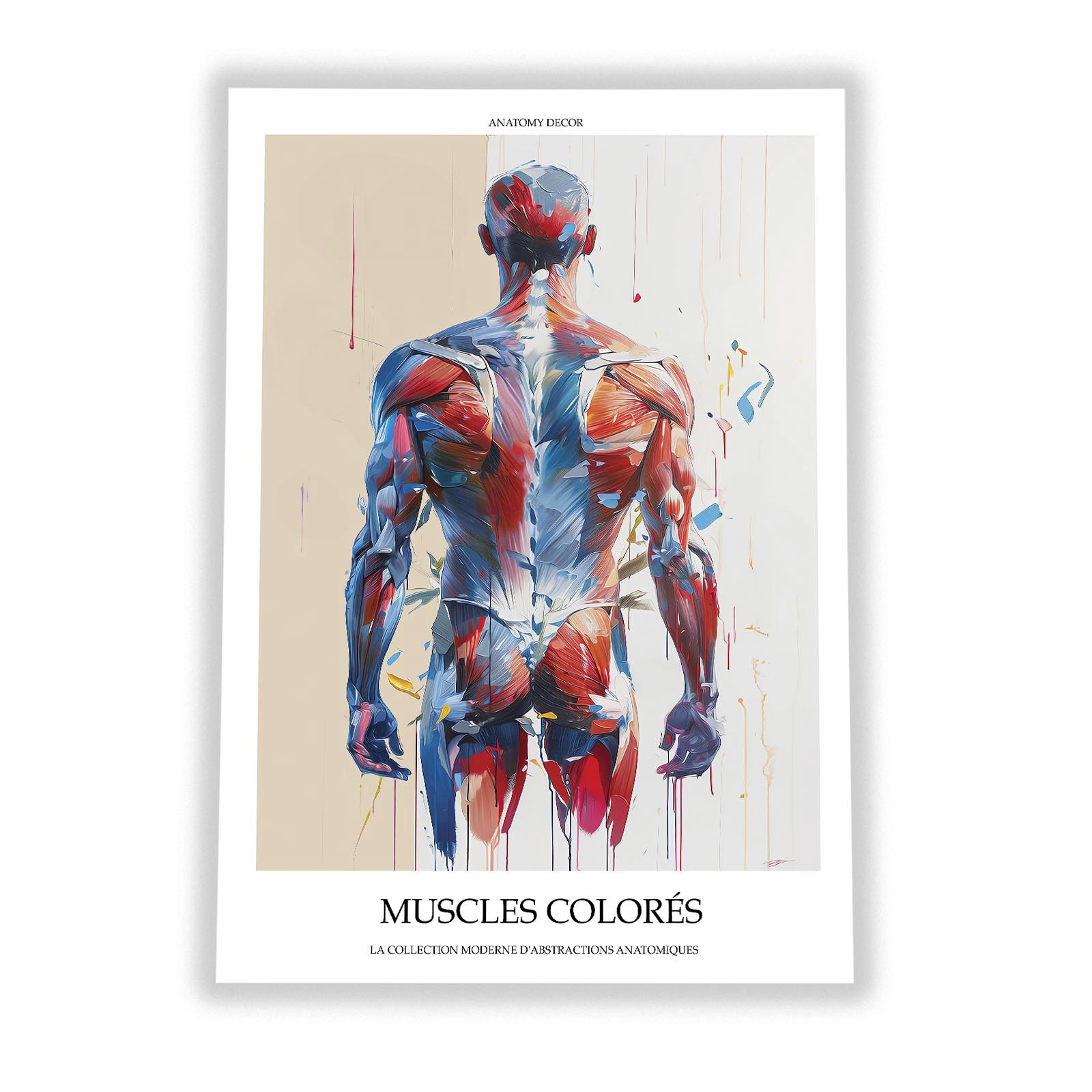 Plakat przedstawia mięśnie człowieka na tle kolorów w motywie passe partout. Grafika została ozdobiona francuskim podpisem “MUSCLES COLORÉS” oznaczającym “Mięśnie w Kolorze”. Plakat jest częścią naszej nowoczesnej kolekcji abstrakcji anatomicznych pt. “La collection moderne d’abstractions anatomiques”.