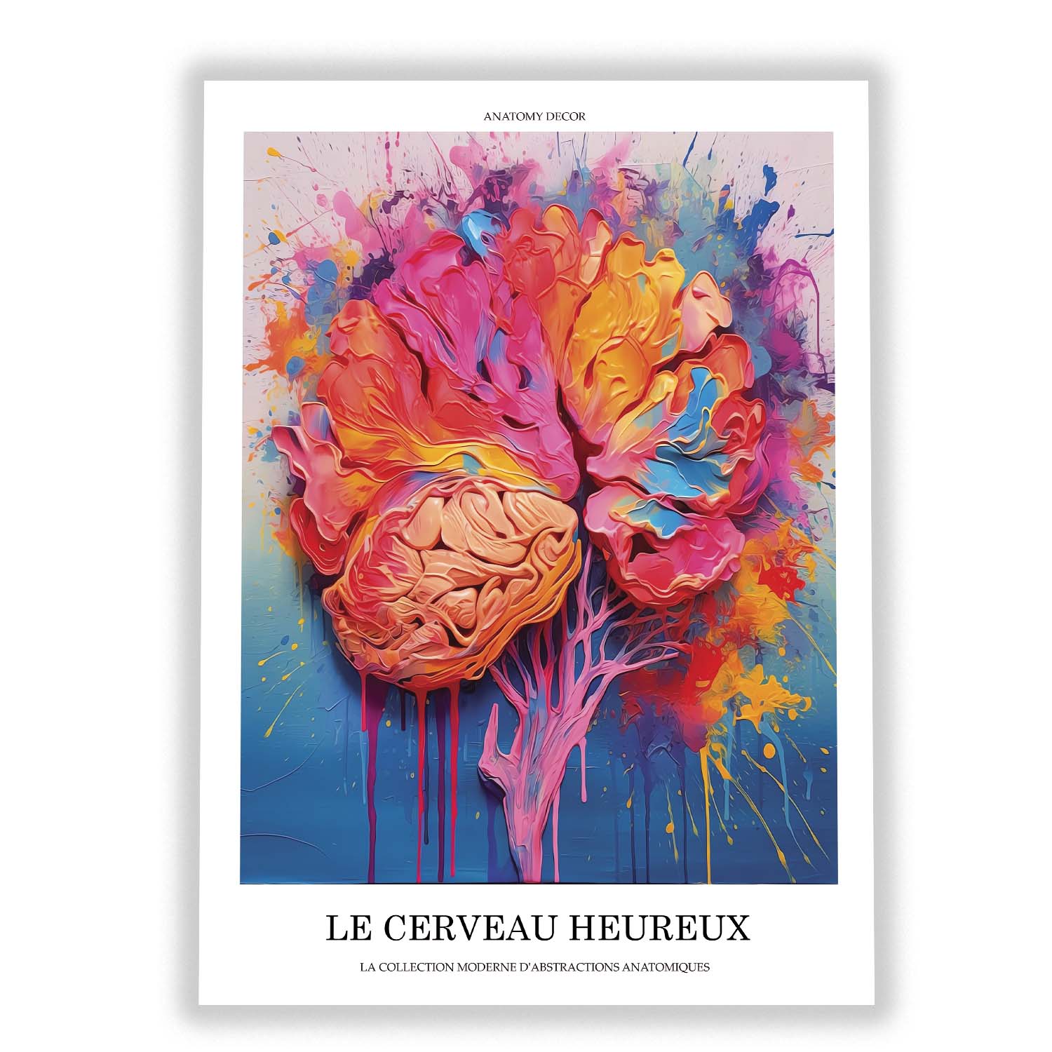 Plakat przedstawia mózg na tle kolorów w motywie passe partout. Grafika została ozdobiona francuskim podpisem “LE CERVEAU HEUREUX” oznaczającym “Wesoły Mózg”. Plakat jest częścią naszej nowoczesnej kolekcji abstrakcji anatomicznych pt. “La collection moderne d’abstractions anatomiques”.