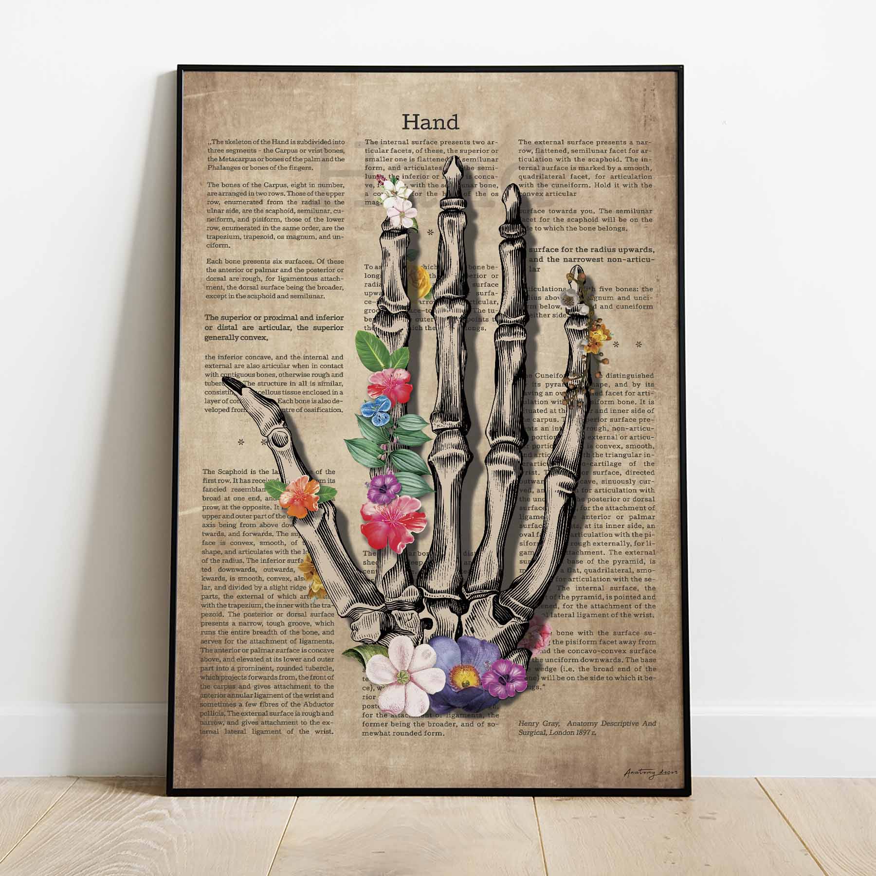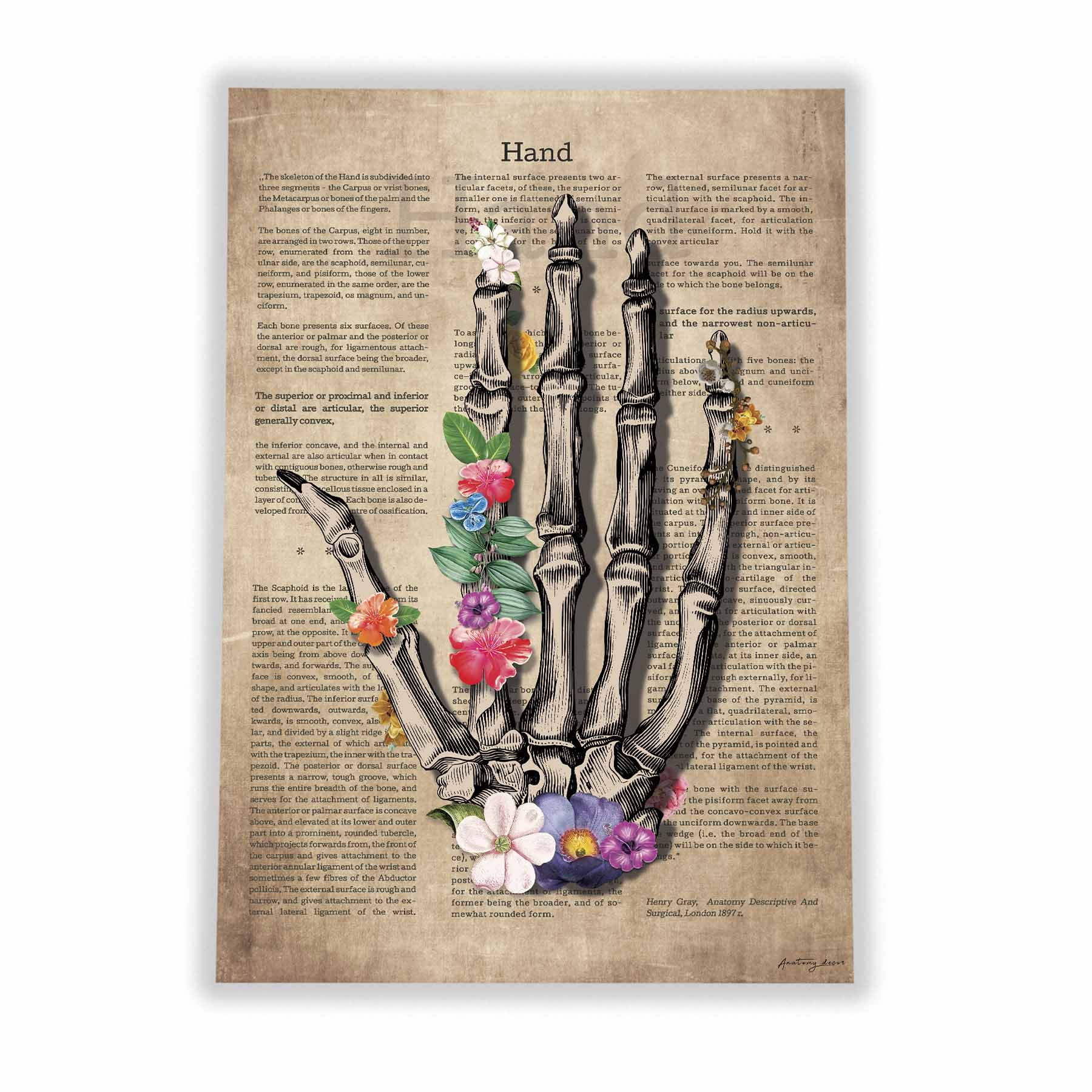 Grafika przedstawia dłoń anatomiczna zdobiony kolorowymi kwiatami na tle odzwierciedlającym stare płótno. Aby jeszcze bardziej oddać styl Vintage ilustracji, dodaliśmy bogate anatomiczne opisy z 1897 roku.