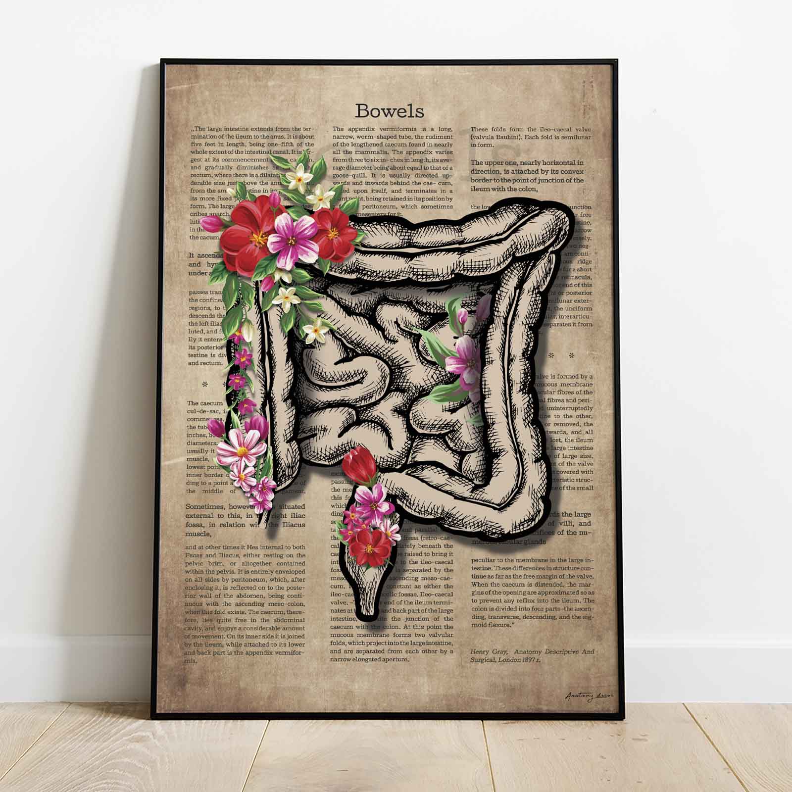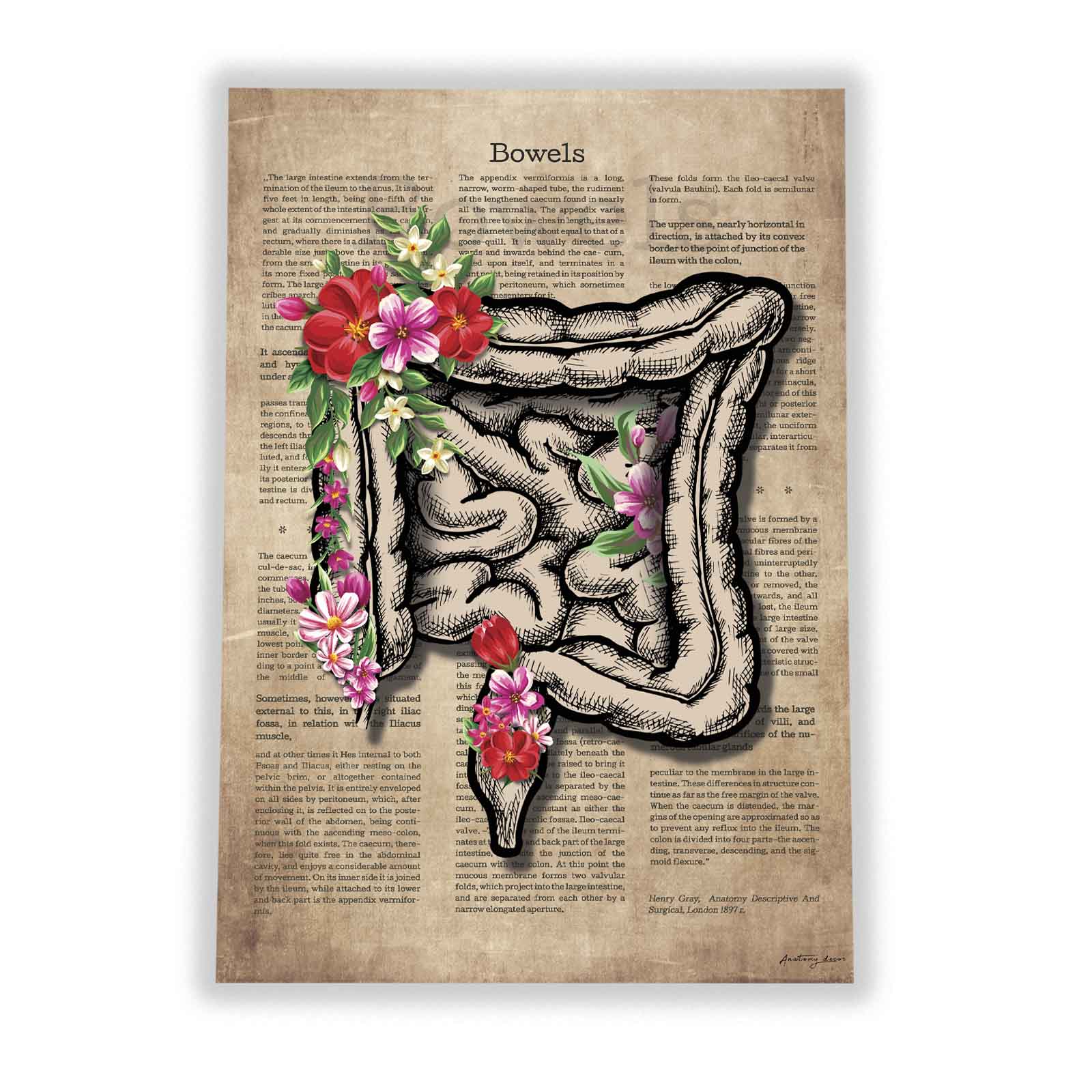 Grafika przedstawia jelita anatomiczne zdobione kolorowymi kwiatami na tle odzwierciedlającym stare płótno. Aby jeszcze bardziej oddać styl Vintage ilustracji, dodaliśmy bogate anatomiczne opisy z 1897 roku.