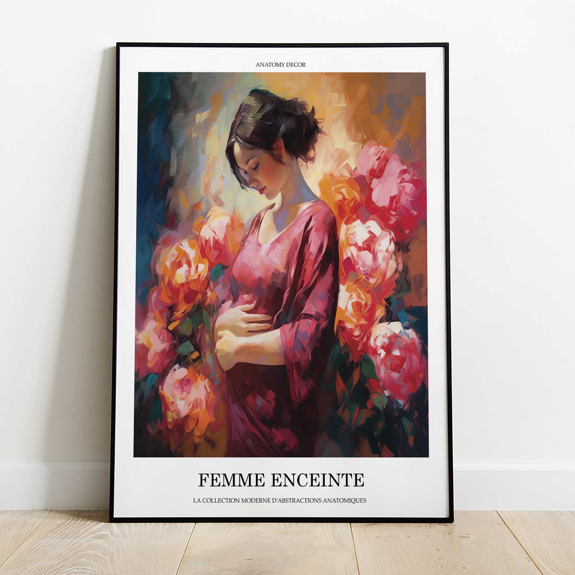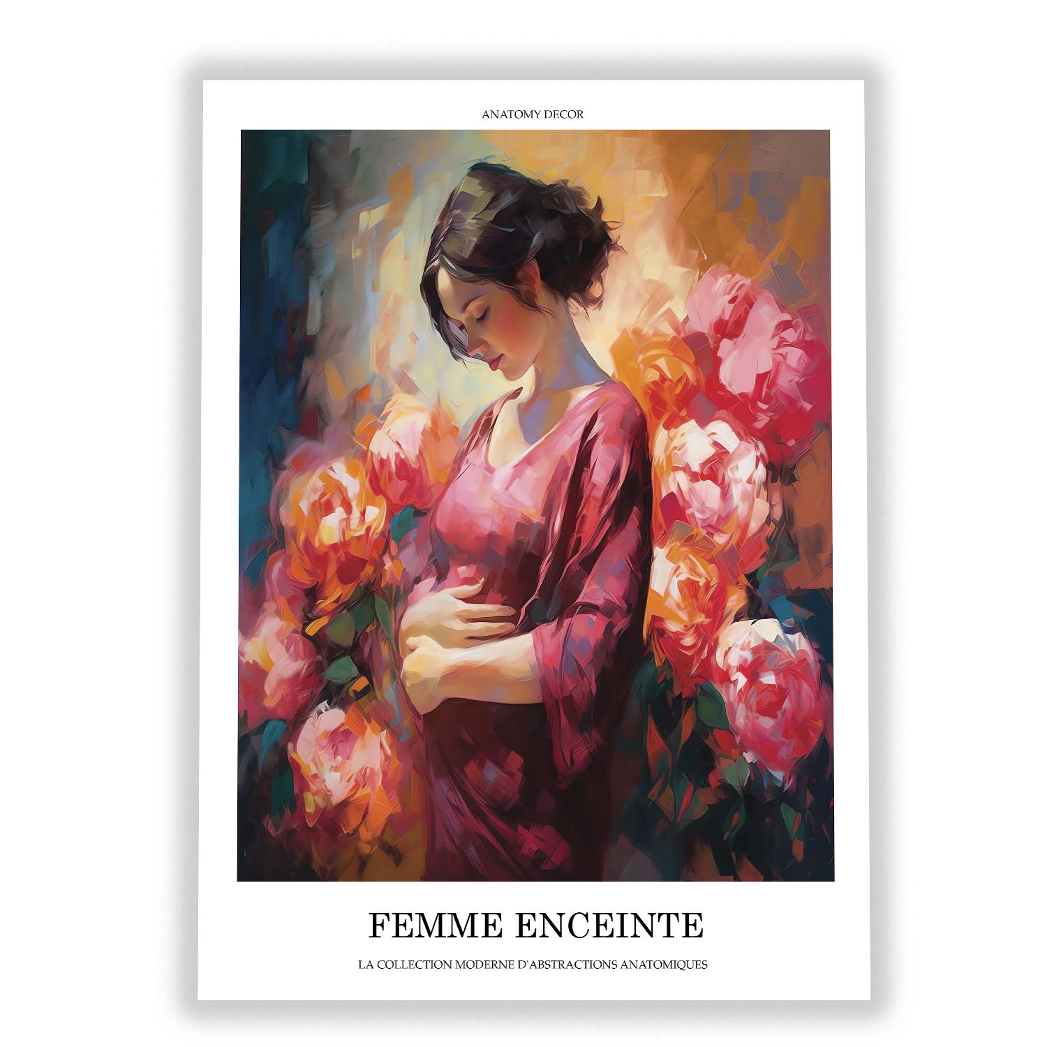 Plakat przedstawia kobietę w ciąży ukazaną na tle kwiatów w motywie passe partout. Grafika została ozdobiona francuskim podpisem “FEMME ENCEINTE” oznaczającym “Kobieta Ciężarna”. Plakat jest częścią naszej nowoczesnej kolekcji abstrakcji anatomicznych pt. “La collection moderne d’abstractions anatomiques”.