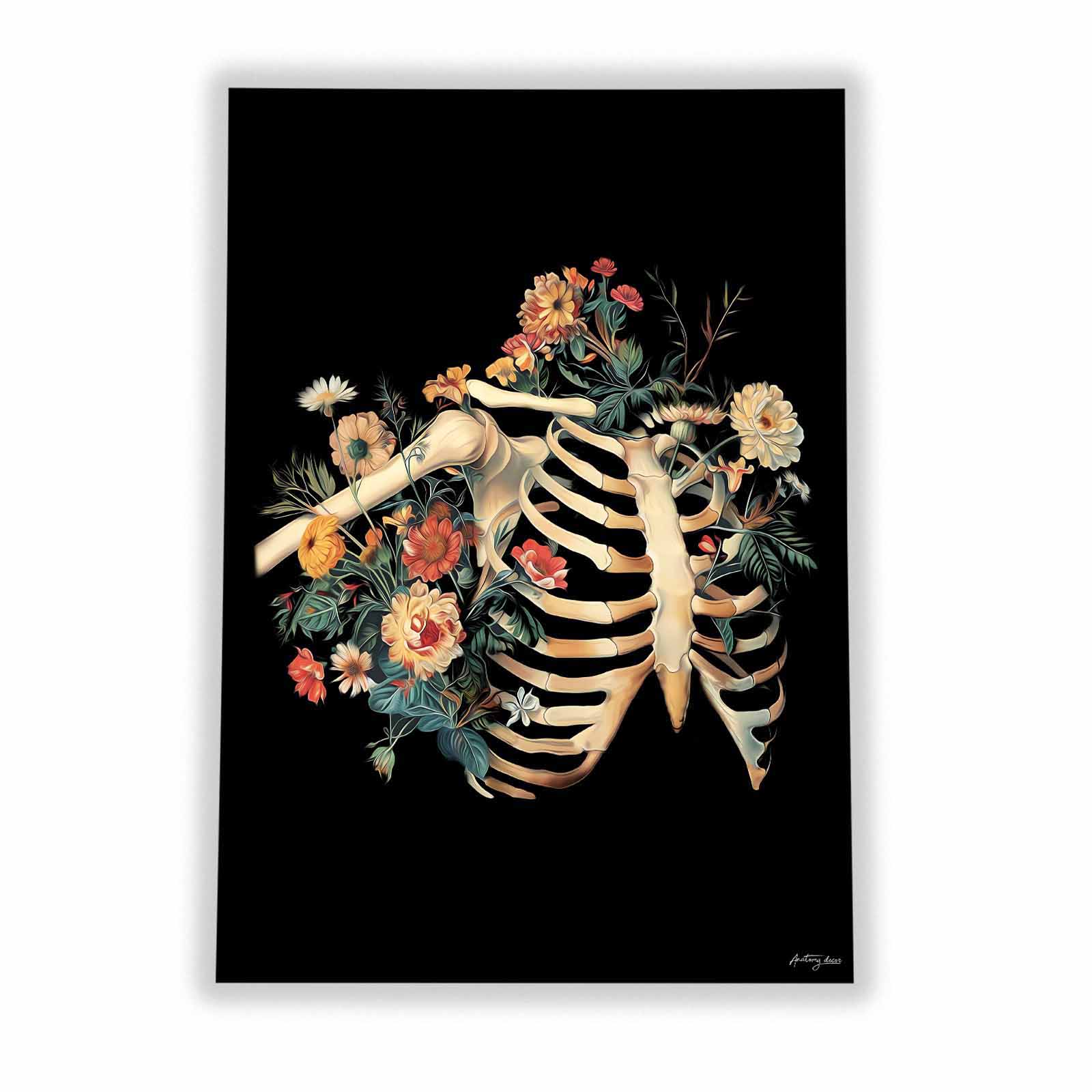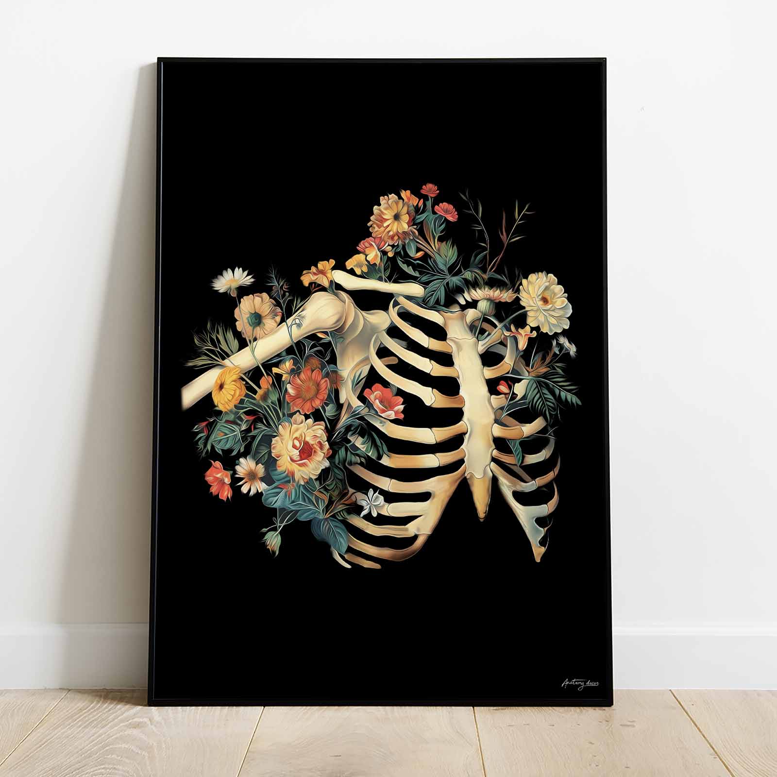 Plakat Klatka Piersiowa w Kompozycji Kwiatowej na Czarnym Tle