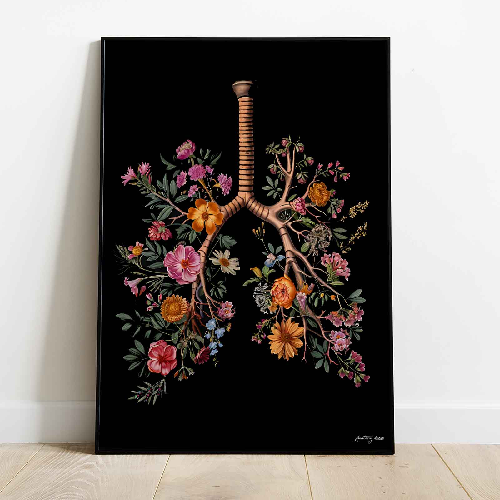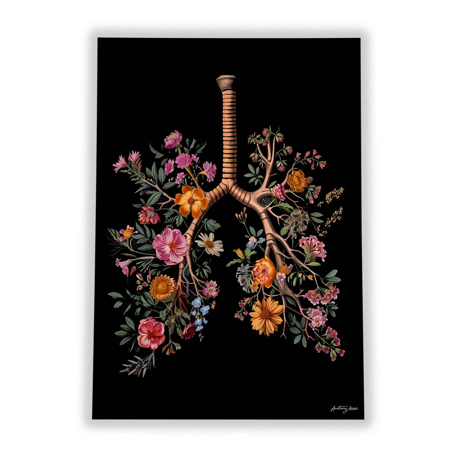 Grafika przedstawia płuca zdobione kolorowymi kwiatami na czarnym tle.