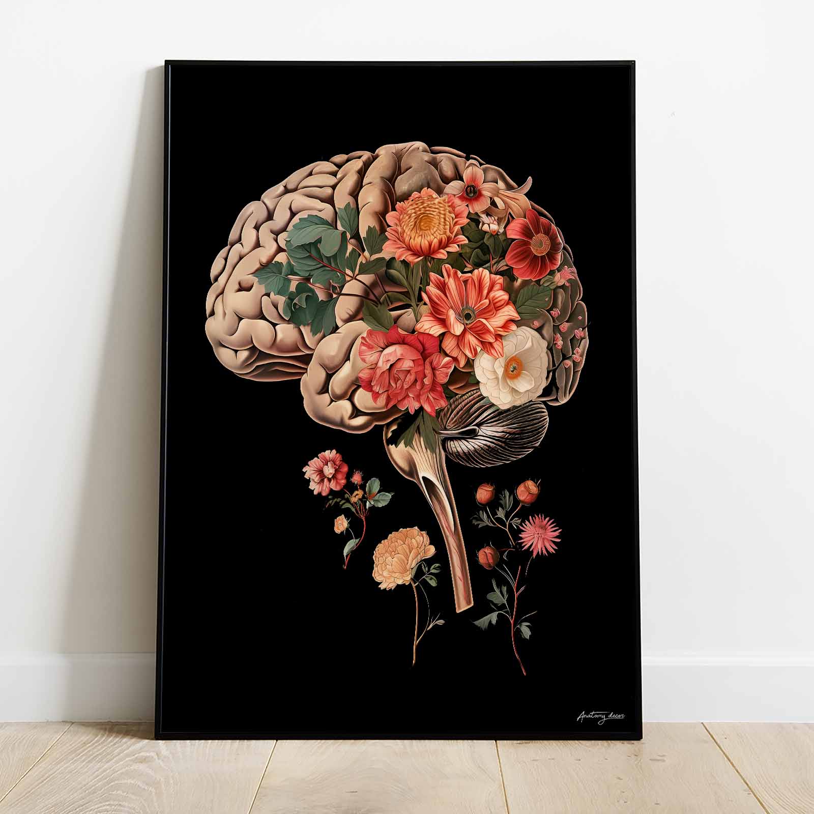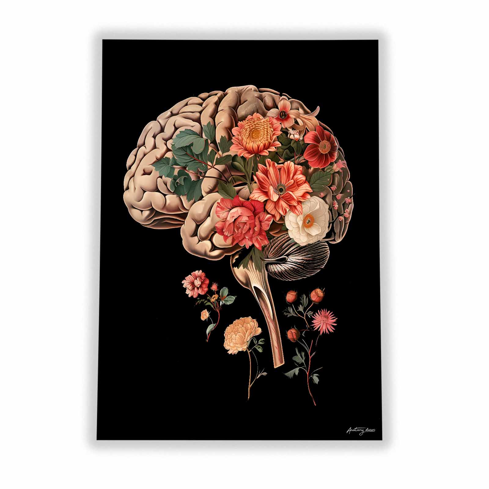 Plakat Mózg w Kompozycji Kwiatowej na Czarnym Tle III