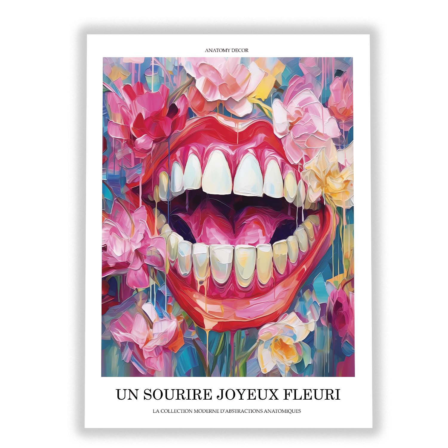 Plakat przedstawia uzębienie ukazane na tle kwiatów w motywie passe partout. Grafika została ozdobiona francuskim podpisem “UN SOURIRE JOYEUX FLEURI” oznaczającym “Wesoły Uśmiech w Kwiatach”. Plakat jest częścią naszej nowoczesnej kolekcji abstrakcji anatomicznych pt. “La collection moderne d’abstractions anatomiques”.