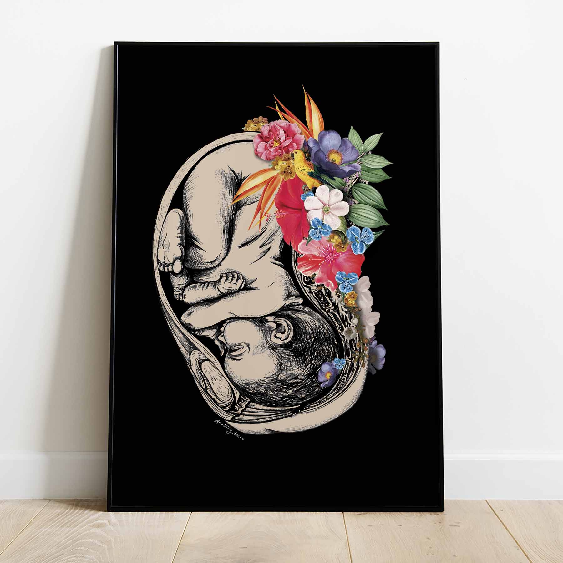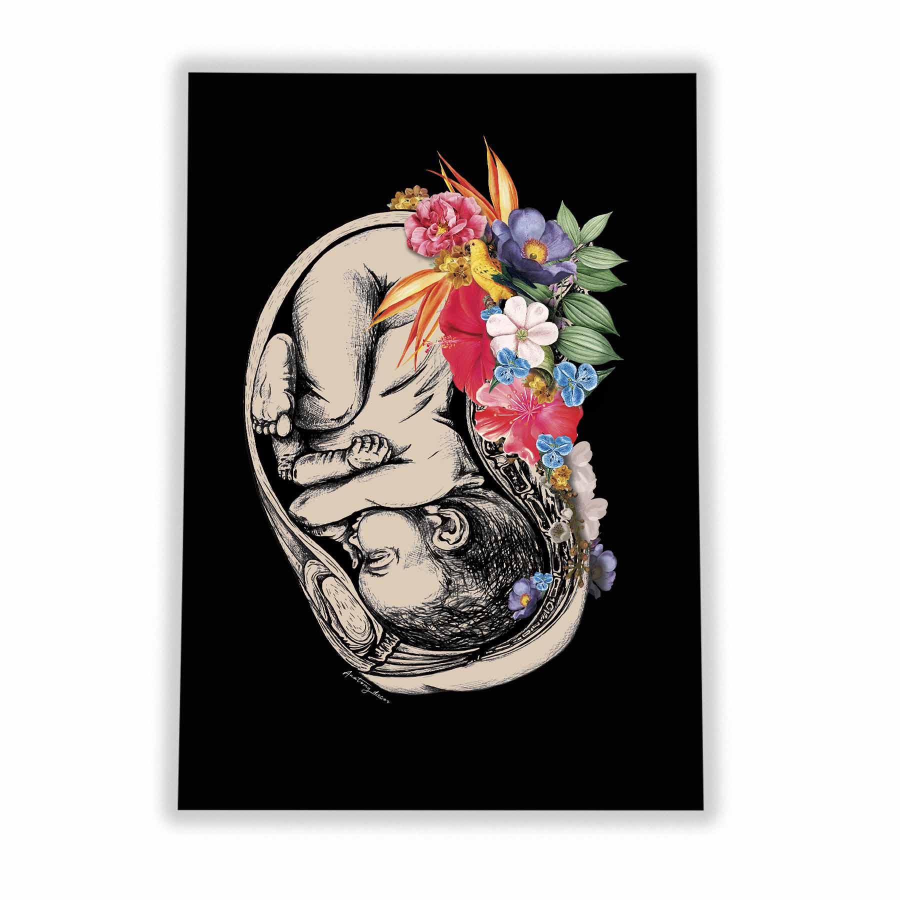 Grafika przedstawia płód zdobiony kolorowymi kwiatami na czarnym tle.
