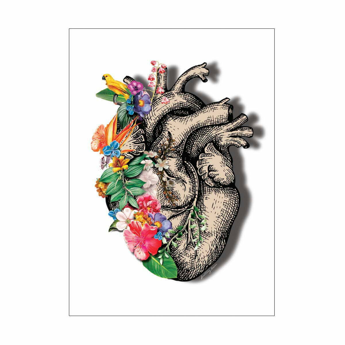 Grafika przedstawia serce anatomiczne zdobione kolorowymi kwiatami na białym tle.