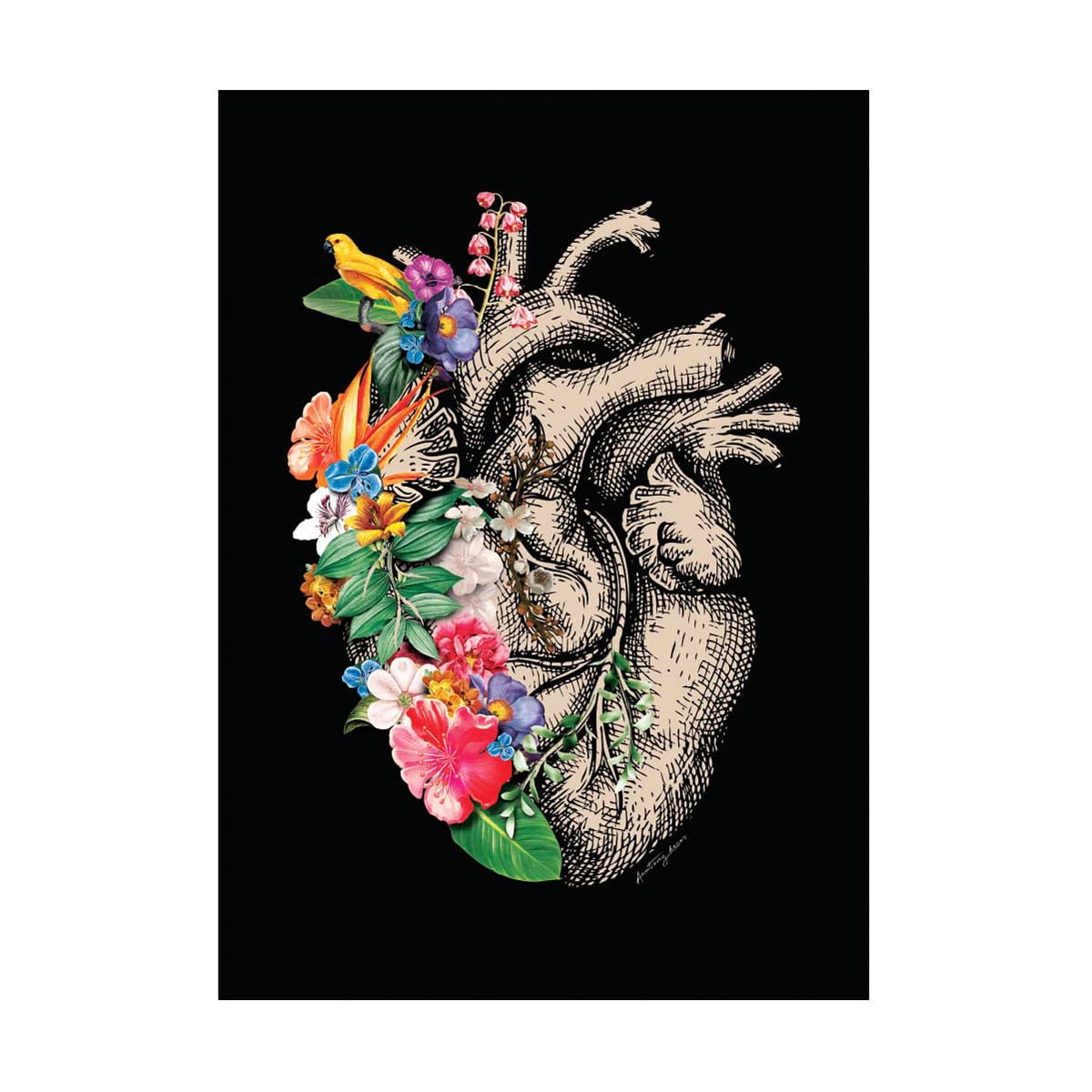 Grafika przedstawia serce anatomiczne zdobione kolorowymi kwiatami na czarnym tle.