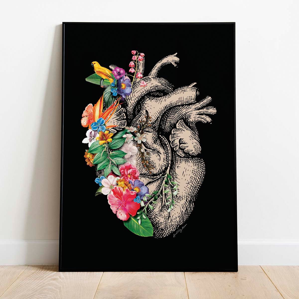Plakat Serce z Kwiatami na Czarnym Tle