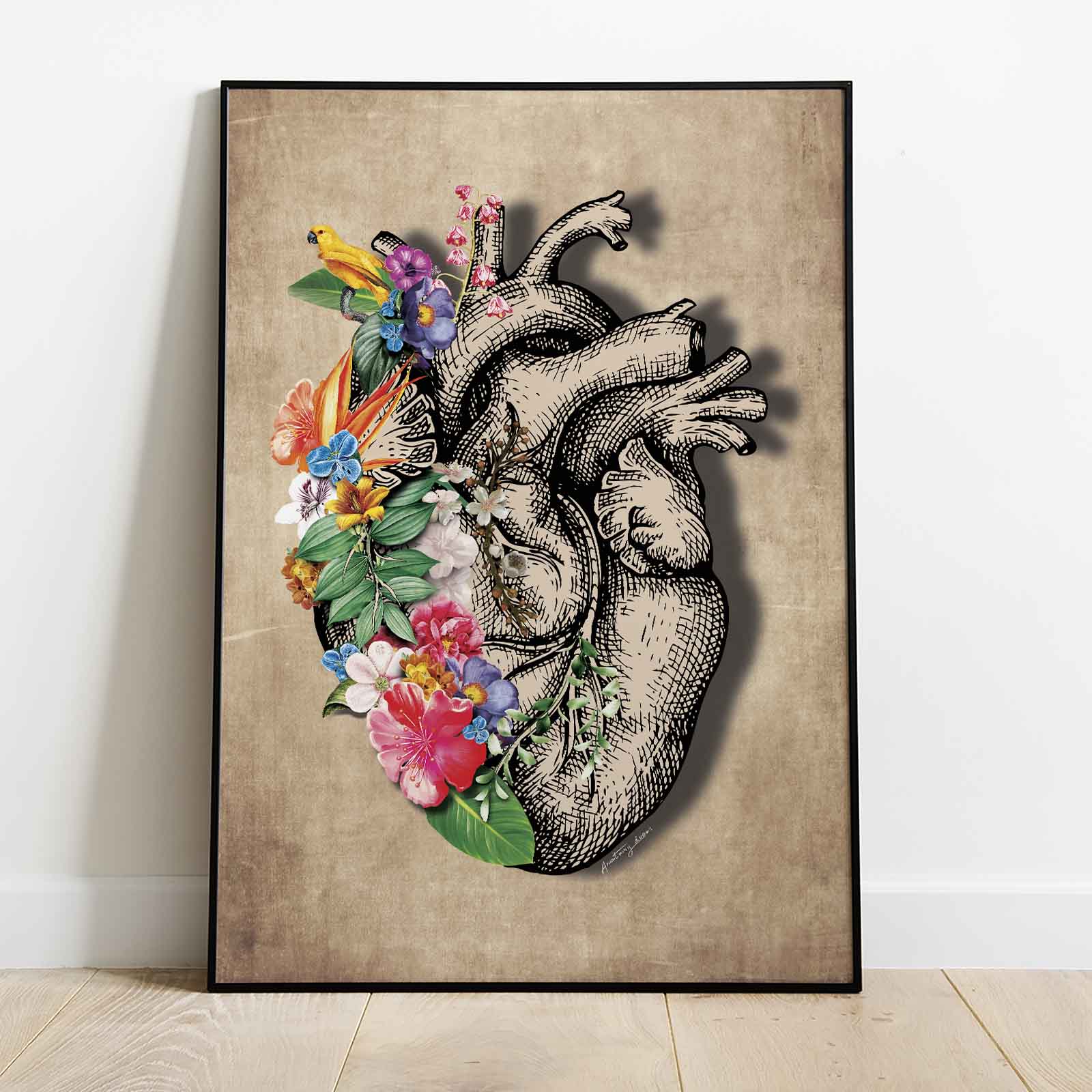 Grafika przedstawia serce anatomiczne zdobiony kolorowymi kwiatami na tle odzwierciedlającym stare płótno.