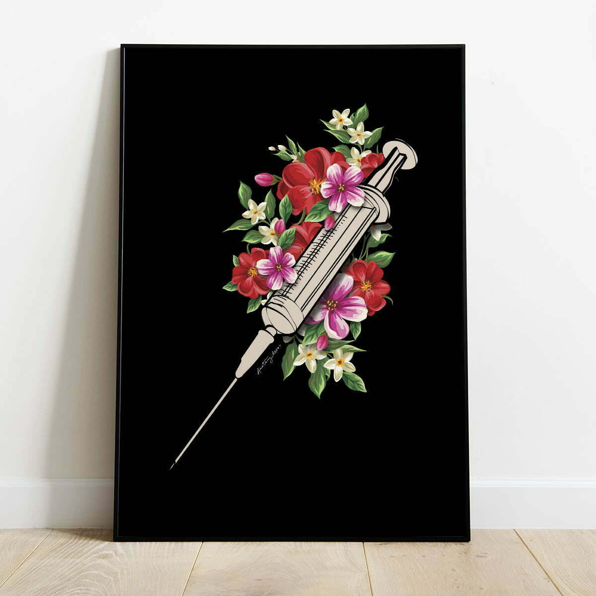 Plakat Strzykawka z Kwiatami na Czarnym Tle II
