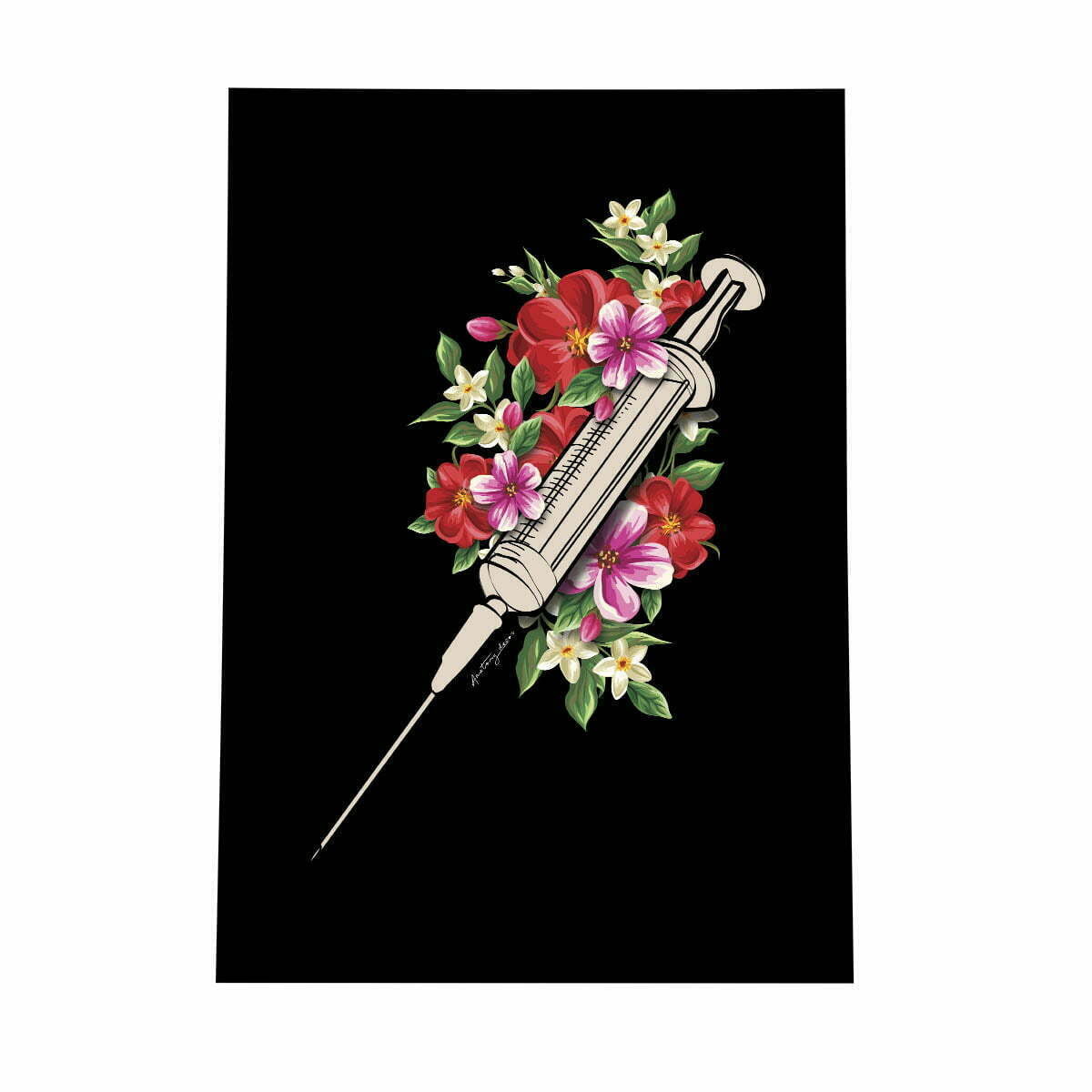 Grafika przedstawia strzykawkę zdobioną kolorowymi kwiatami na czarnym tle.