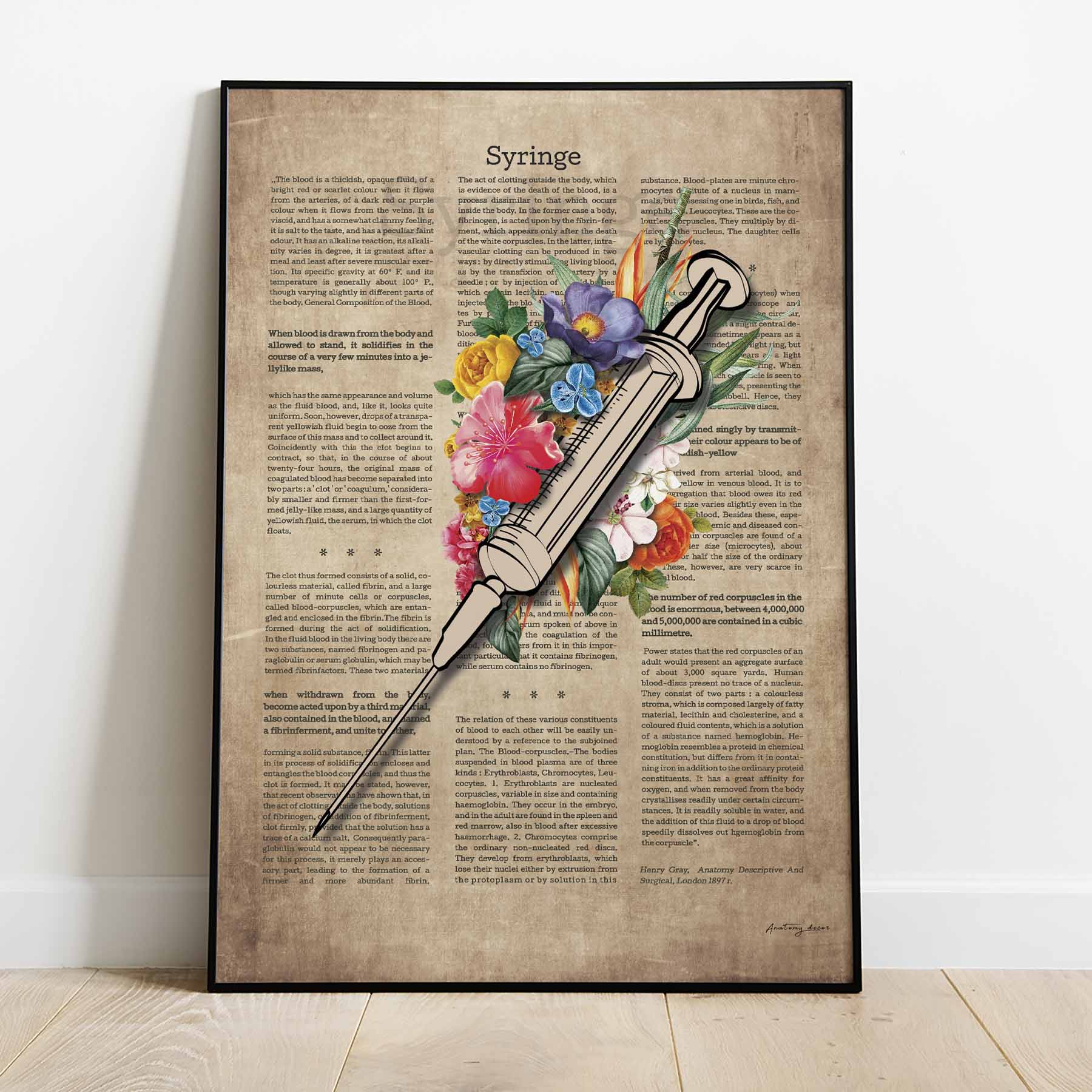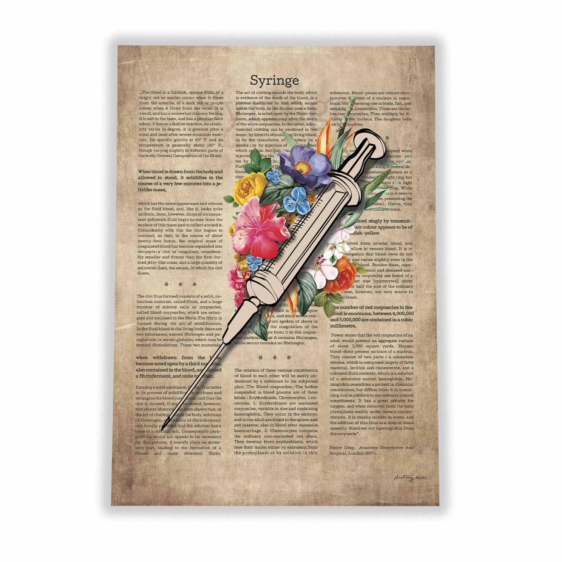 Grafika przedstawia strzykawkę zdobione kolorowymi kwiatami na tle odzwierciedlającym stare płótno. Aby jeszcze bardziej oddać styl Vintage ilustracji, dodaliśmy bogate anatomiczne opisy z 1897 roku.
