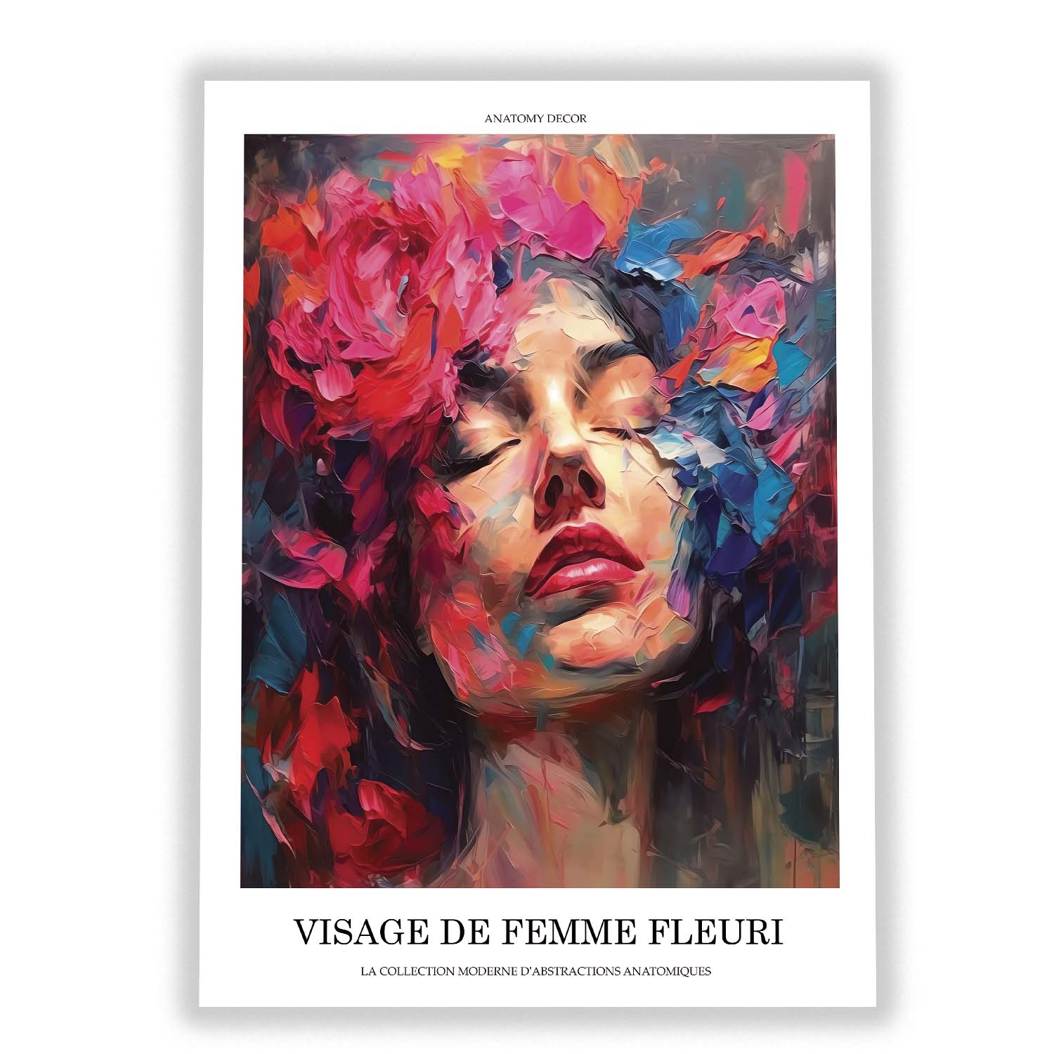 Plakat przedstawia twarz kobiety ukazaną na tle kwiatów w motywie passe partout. Grafika została ozdobiona francuskim podpisem “VISAGE DE FEMME FLEURI” oznaczającym “Twarz Kobieca w Kwiatach”. Plakat jest częścią naszej nowoczesnej kolekcji abstrakcji anatomicznych pt. “La collection moderne d’abstractions anatomiques”.