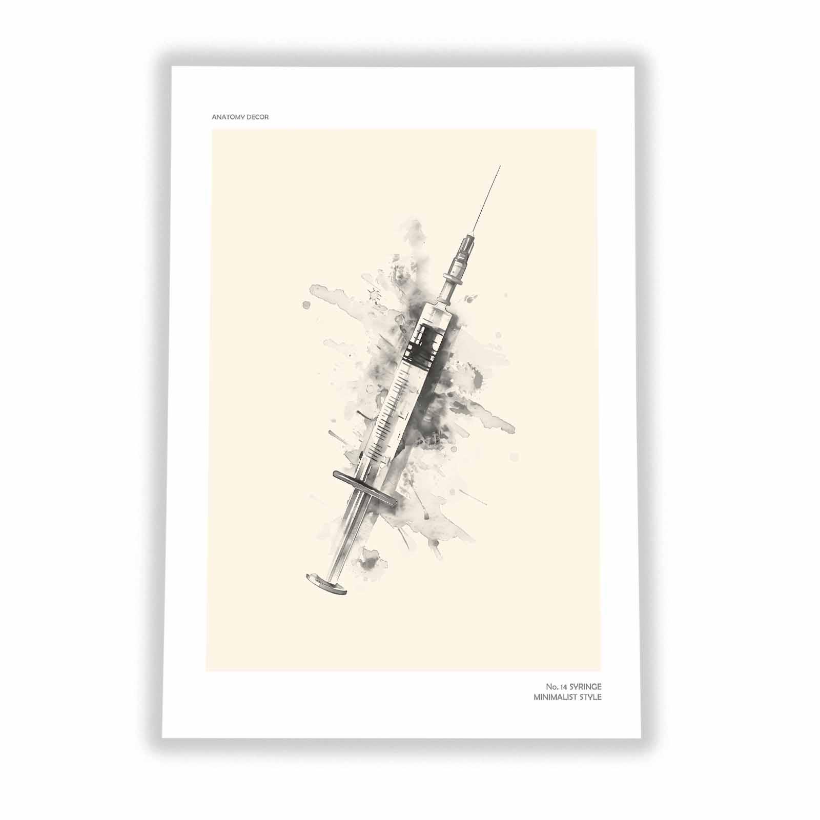 Plakat przedstawia strzykawki w minimalistycznym stylu, z motywem passe-partout. Seria plakatów w stylu minimalistycznym to propozycja dla osób, które szukają prostoty, ale nie rezygnują z elegancji. Plakaty z powodzeniem wpasują się w każde wnętrze, wprowadzając do niego element nowoczesnej sztuki. Jasnobeżowa baza tła stanowi doskonałą oprawę dla minimalistycznych grafik, wprowadzając harmonię i spokój do medycznej przestrzeni.