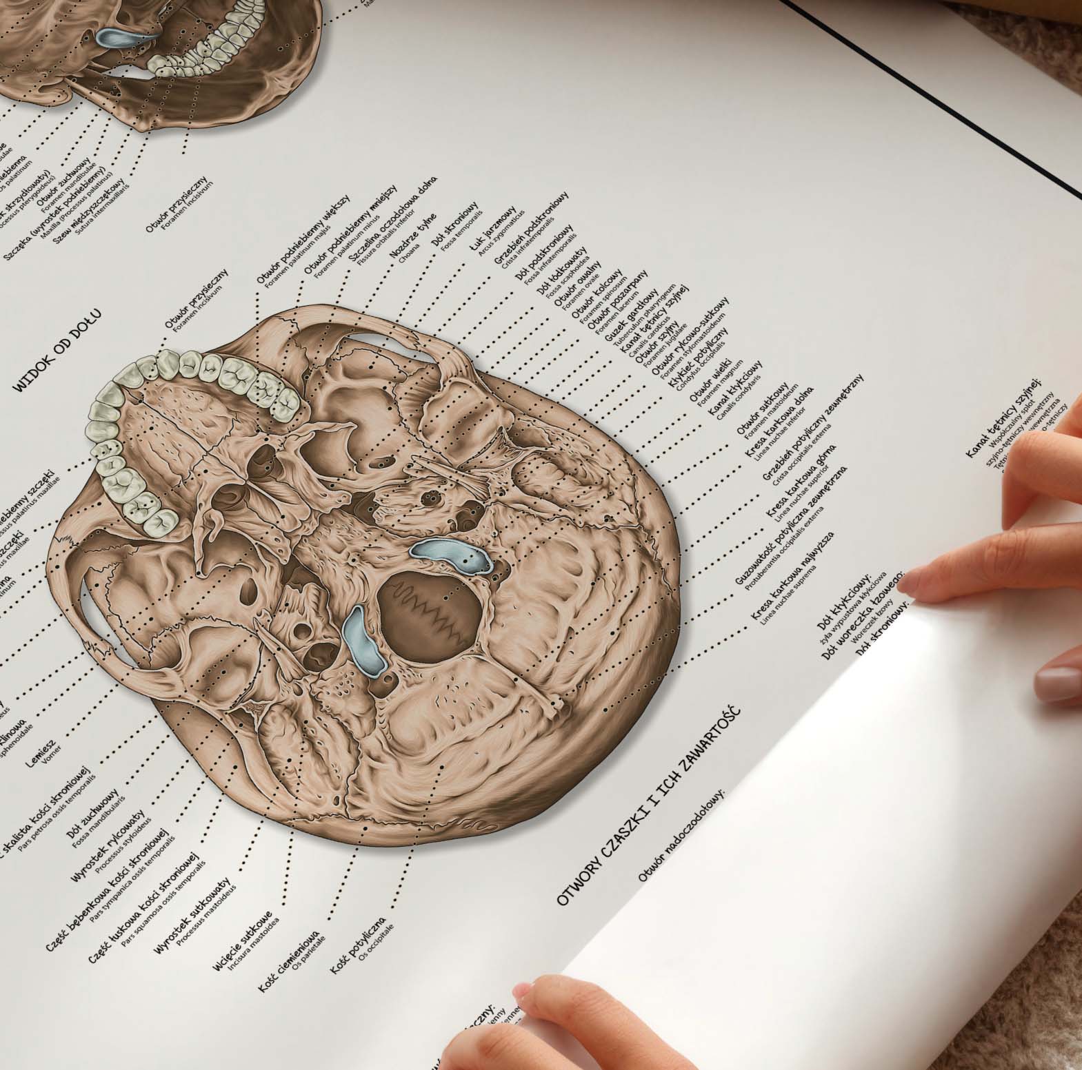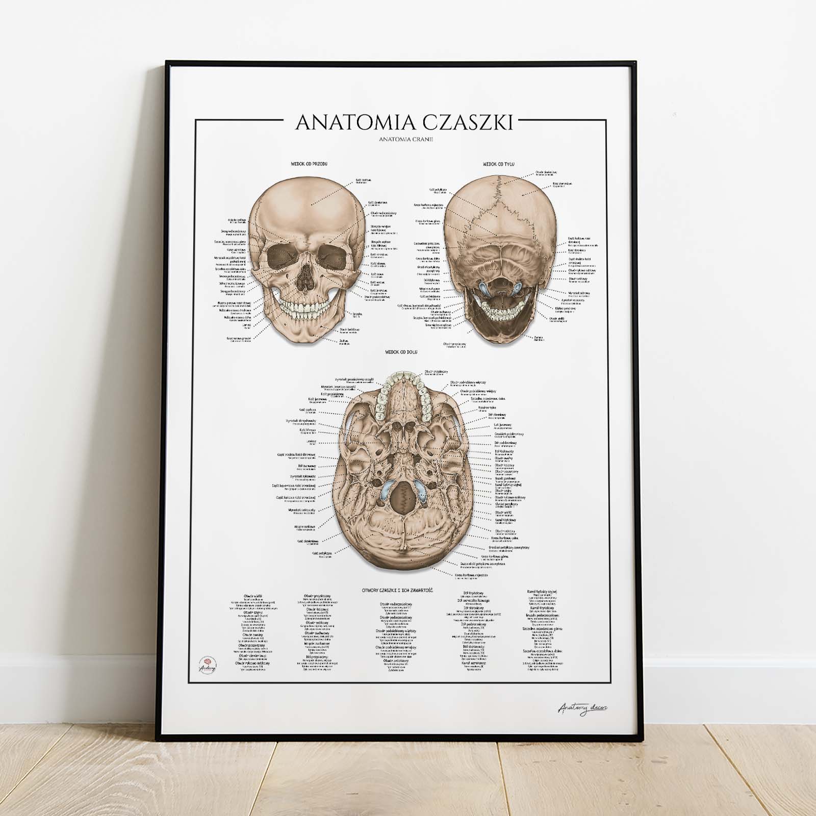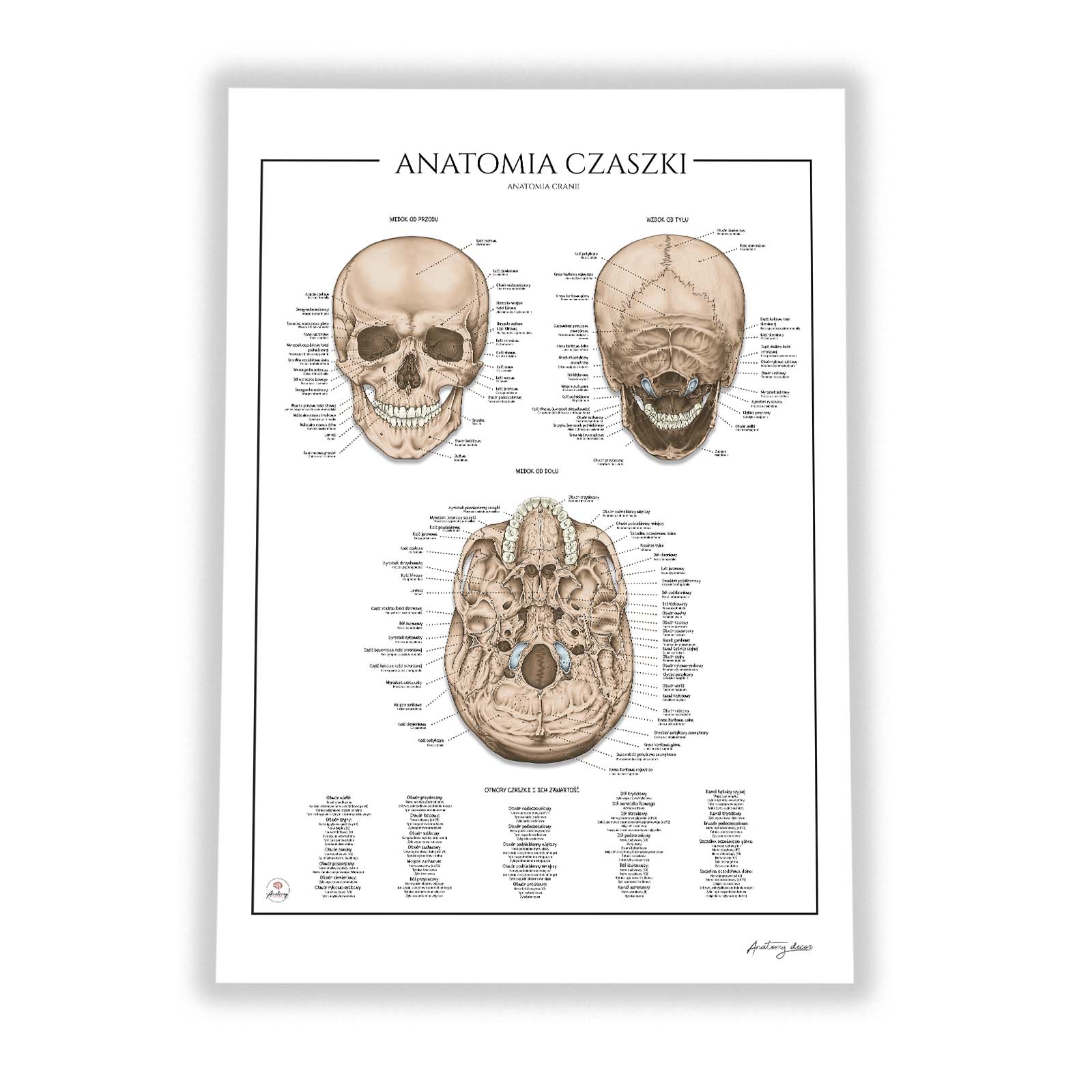 Anatomia czaszki – budowa, otwory i zawartość to szczegółowa plansza anatomiczna przedstawiająca budowę czaszki w trzech projekcjach. Ilustracja ukazuje zarówno twarzoczaszkę, jak i mózgoczaszkę, wraz z relacjami między poszczególnymi kośćmi. Dodatkowo zawiera zestawienie otworów czaszki oraz ich zawartości, co czyni ją doskonałym materiałem dydaktycznym i pomocnym narzędziem w codziennej praktyce. Wszystkie elementy zostały dokładnie opisane w języku polskim i łacińskim.