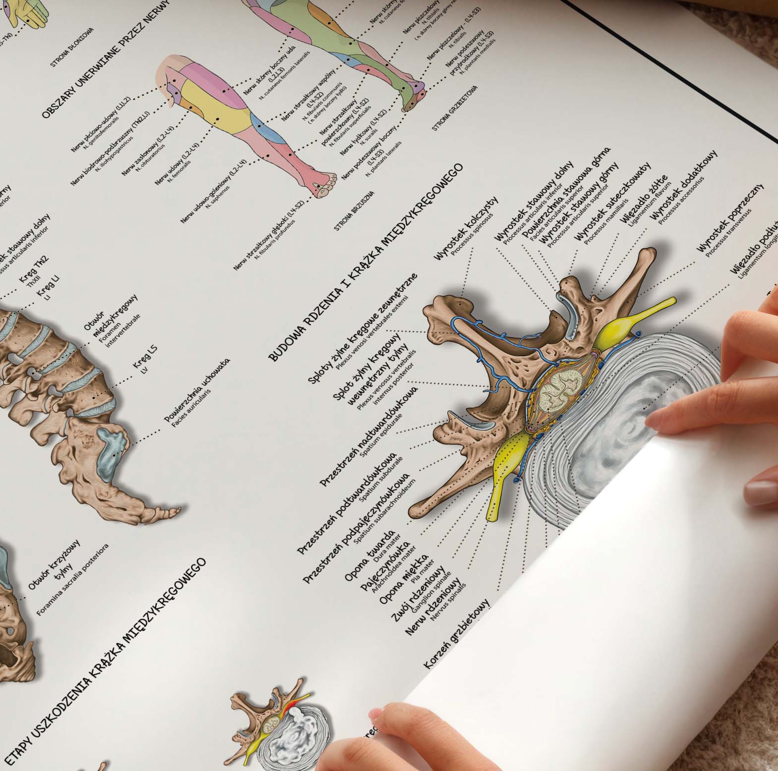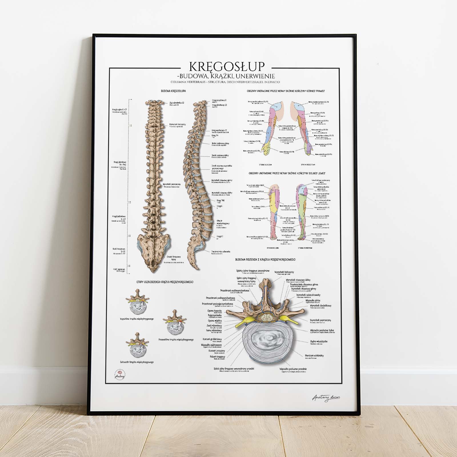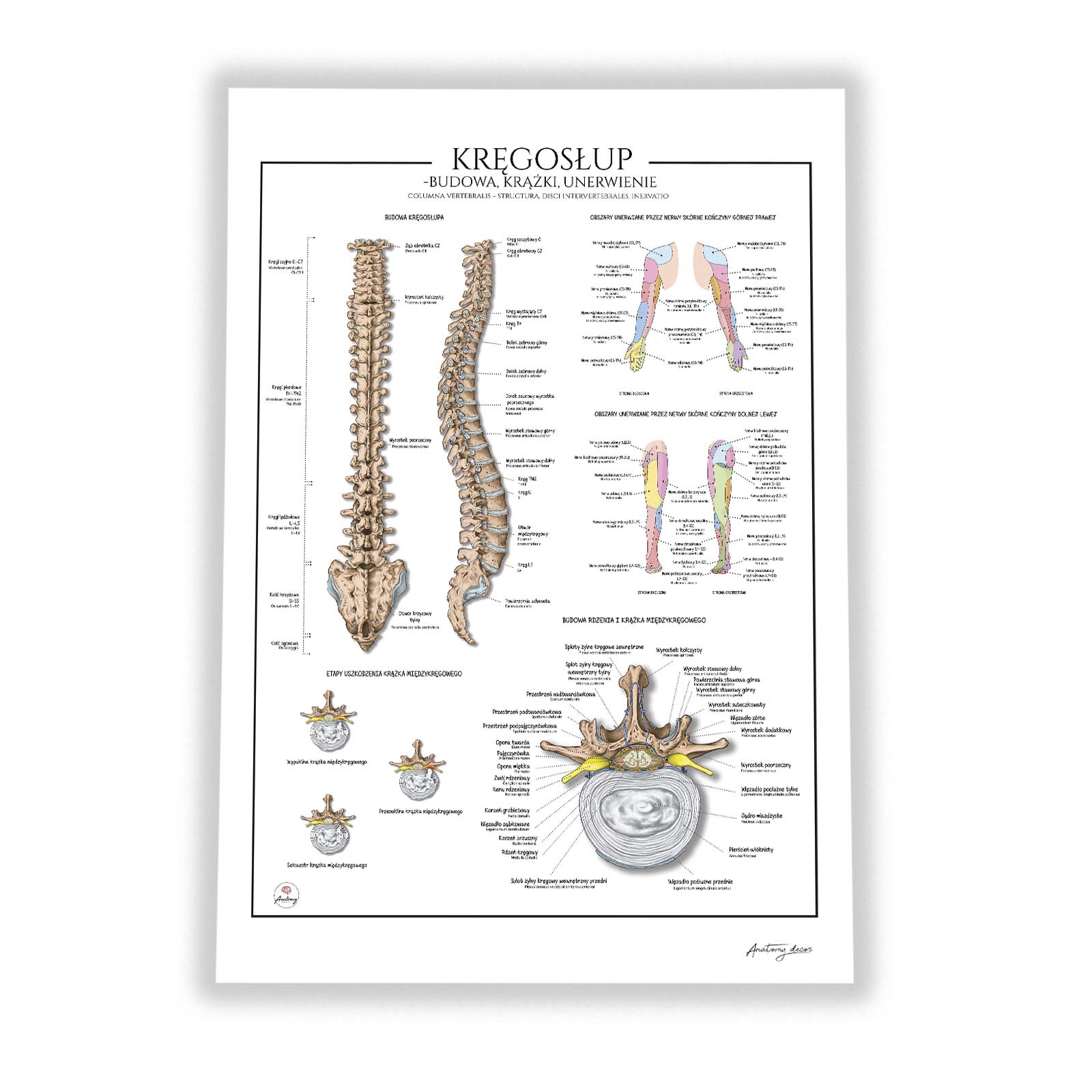 Anatomia kręgosłupa – dyskopatia i unerwienie to szczegółowa plansza anatomiczna przedstawiająca budowę kręgosłupa, anatomię oraz etapy uszkodzenia krążka międzykręgowego. Zawiera również ilustracje obrazujące obszary unerwienia skórnego kończyn górnych i dolnych oraz budowę rdzenia kręgowego. Plansza stanowi doskonały materiał dydaktyczny i praktyczne narzędzie w codziennej praktyce.