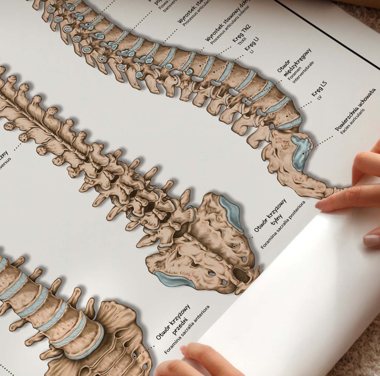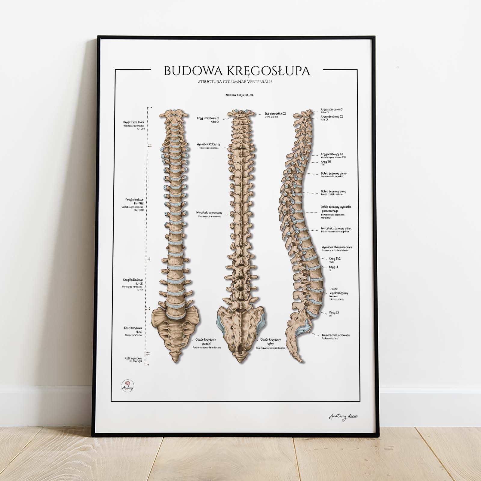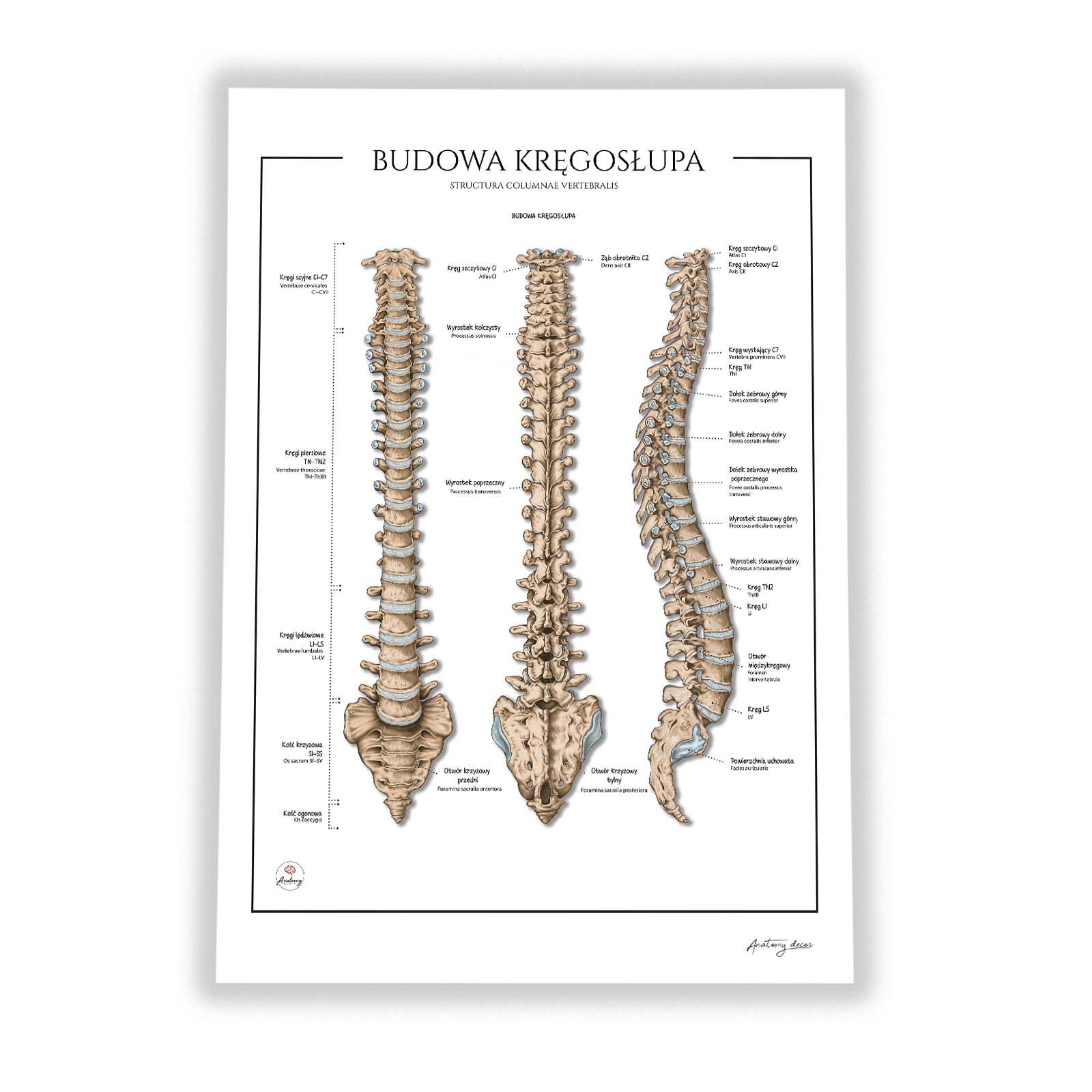 Anatomia kręgosłupa to szczegółowa plansza anatomiczna przedstawiająca budowę kręgosłupa w trzech projekcjach. Ilustracja ukazuje relacje między poszczególnymi elementami, występujące krzywizny oraz połączenia stawowe, dzięki czemu stanowi doskonały materiał dydaktyczny i praktyczne narzędziecodziennej pracy. Wszystkie elementy zostały dokładnie opisane w języku polskim i łacińskim.