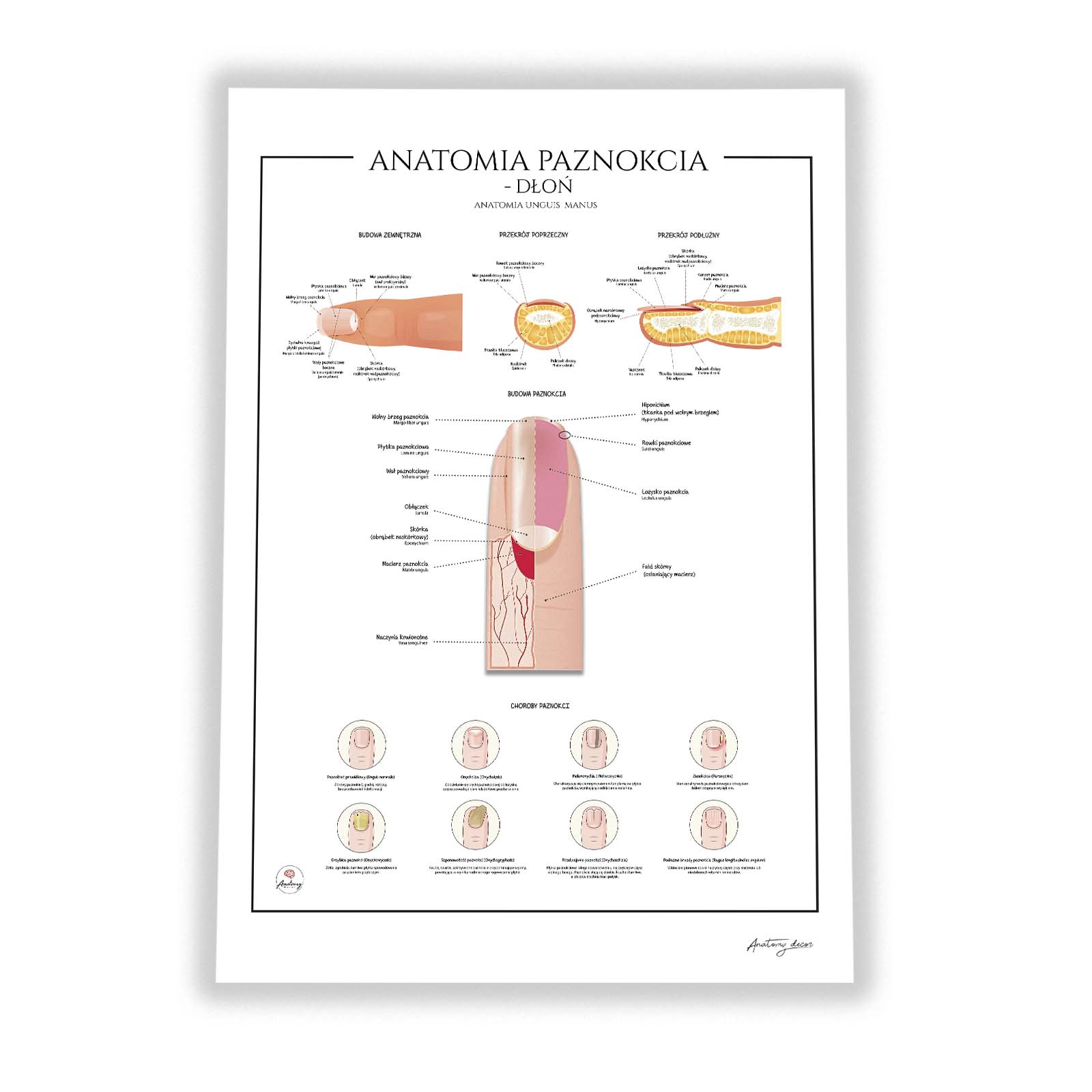 Anatomia paznokcia dłoni to szczegółowa plansza anatomiczna przedstawiająca budowę paznokcia dłoni oraz struktur otaczających. Na ilustracji ukazano przekrój poprzeczny i podłużny palca, pozwalający dokładnie zobaczyć relacje między płytką, łożyskiem, macierzą i wałem paznokciowym. Plansza prezentuje także najczęstsze problemy z paznokciami.