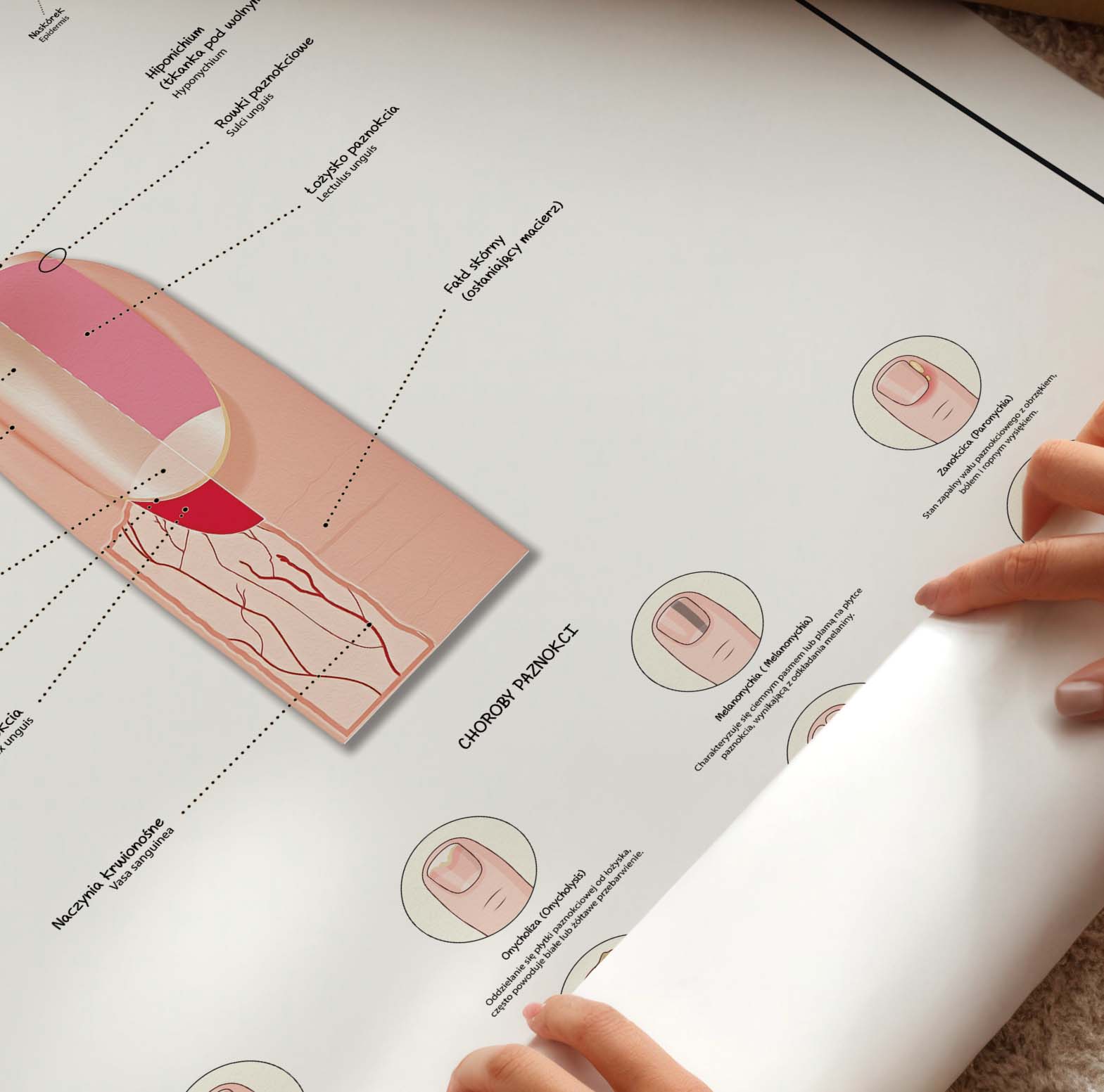 Plansza prezentuje także najczęstsze problemy z paznokciami dłoni. Plansza wyróżnia się wysoką szczegółowością i przejrzystym układem, dzięki czemu doskonale sprawdza się w gabinetach podologicznych, dermatologicznych i kosmetologicznych.