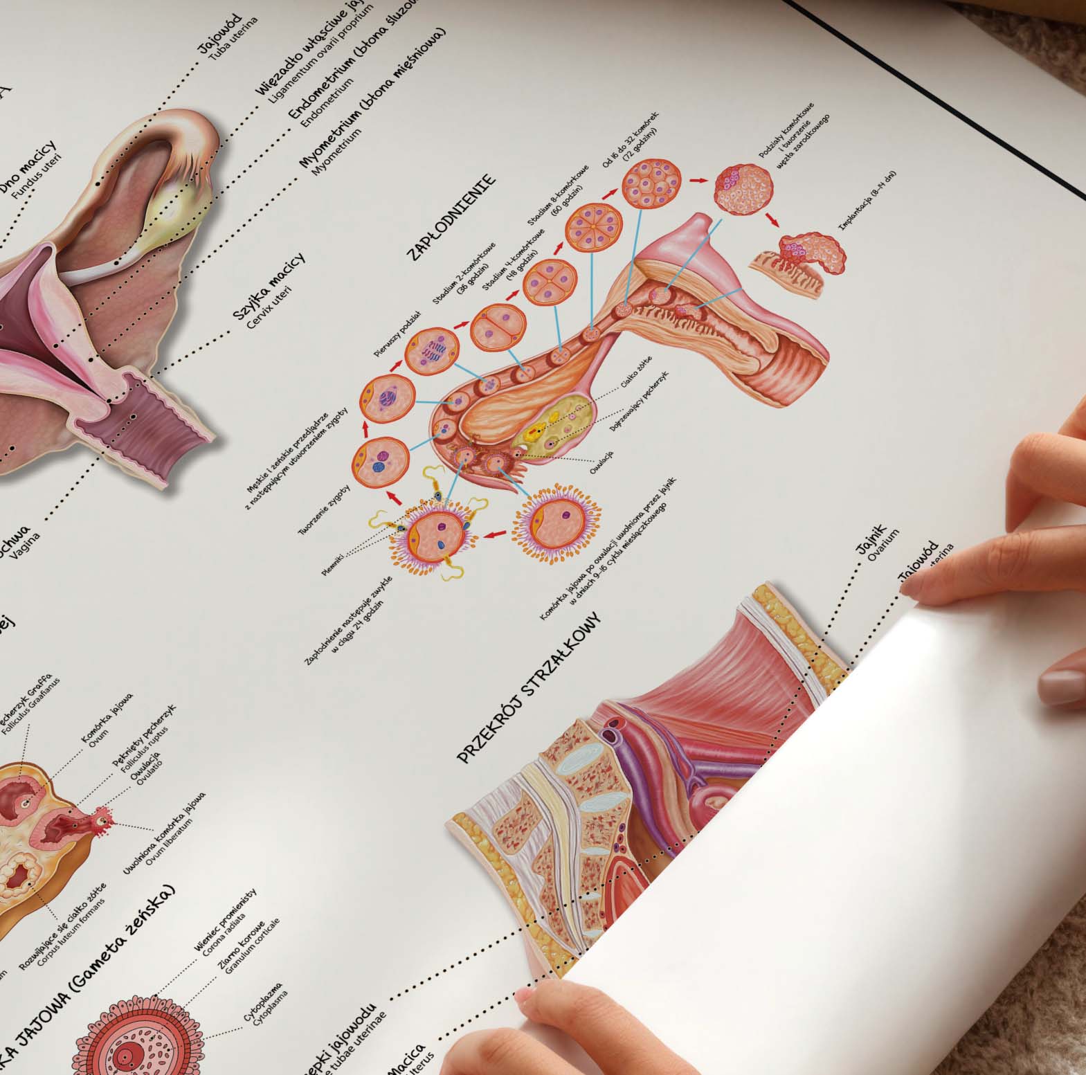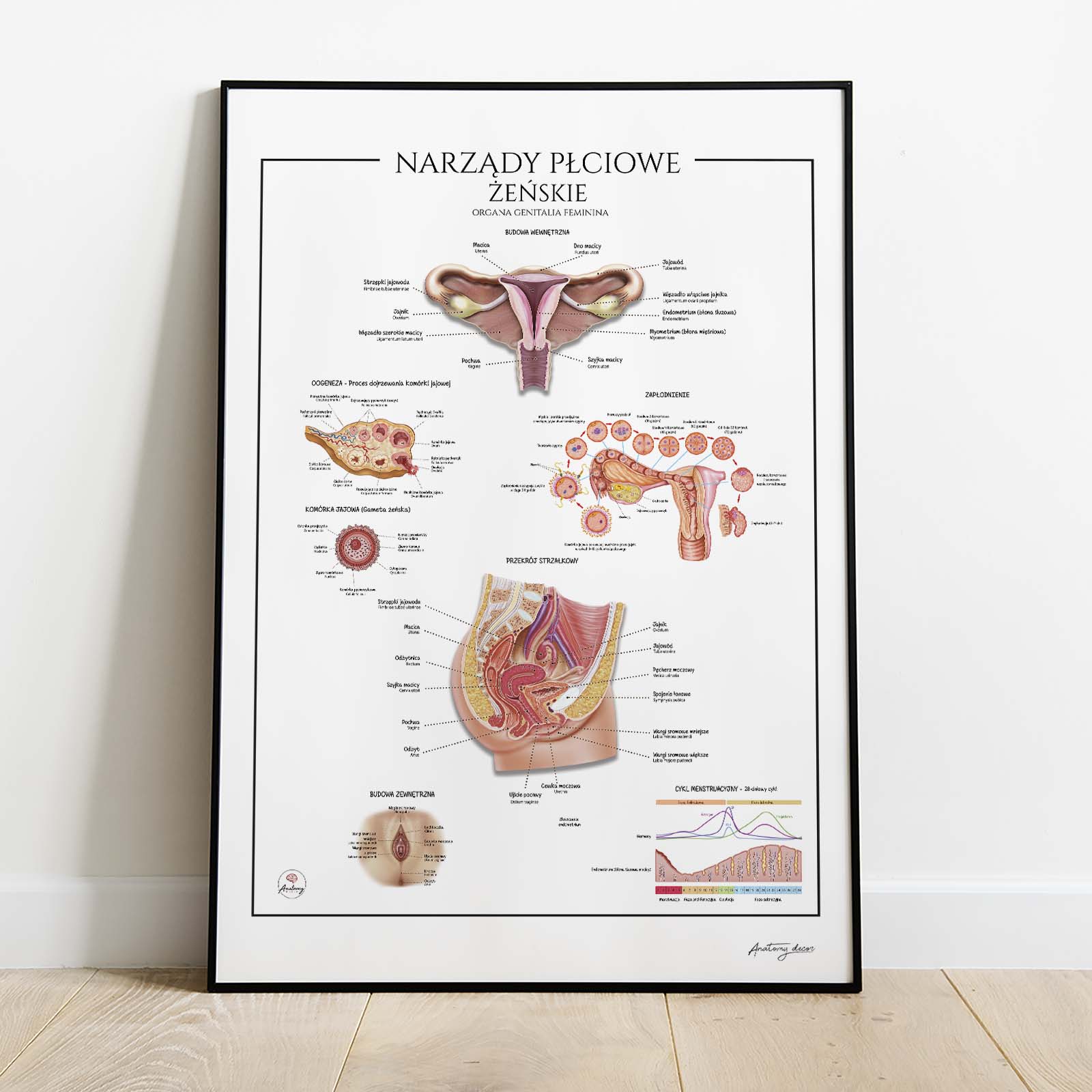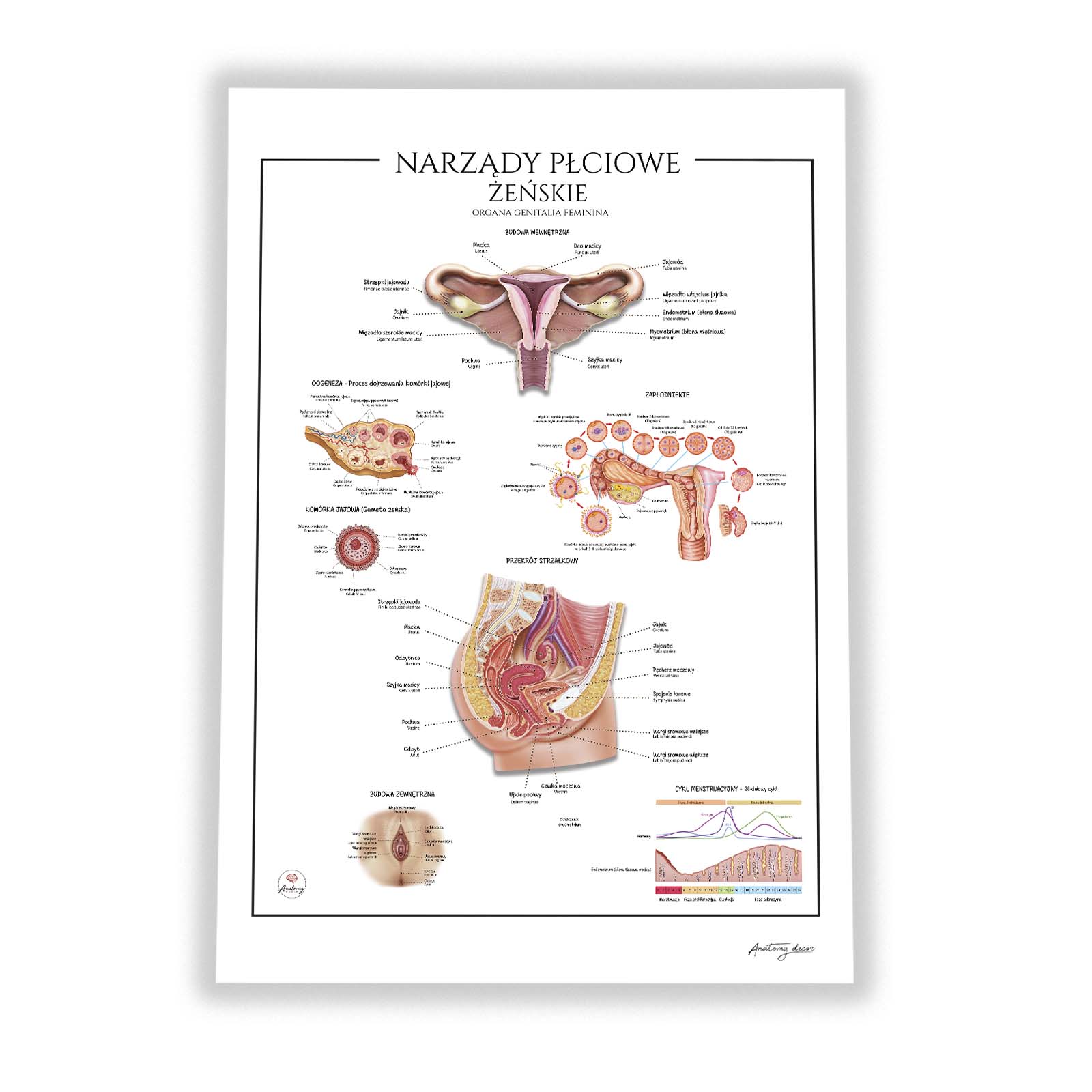 Narządy Płciowe Żeńskie to elegancka i szczegółowa plansza anatomiczna, przedstawiająca budowę żeńskiego układu rozrodczego – zarówno wewnętrznych, jak i zewnętrznych narządów płciowych. Na ilustracji zobaczysz m.in. macicę, jajniki, jajowody, pochwę, wargi sromowe, a także przekrój strzałkowy miednicy, proces oogenezy, etapy zapłodnienia i cykl menstruacyjny. Wszystkie elementy zostały dokładnie opisane w języku polskim i łacińskim.