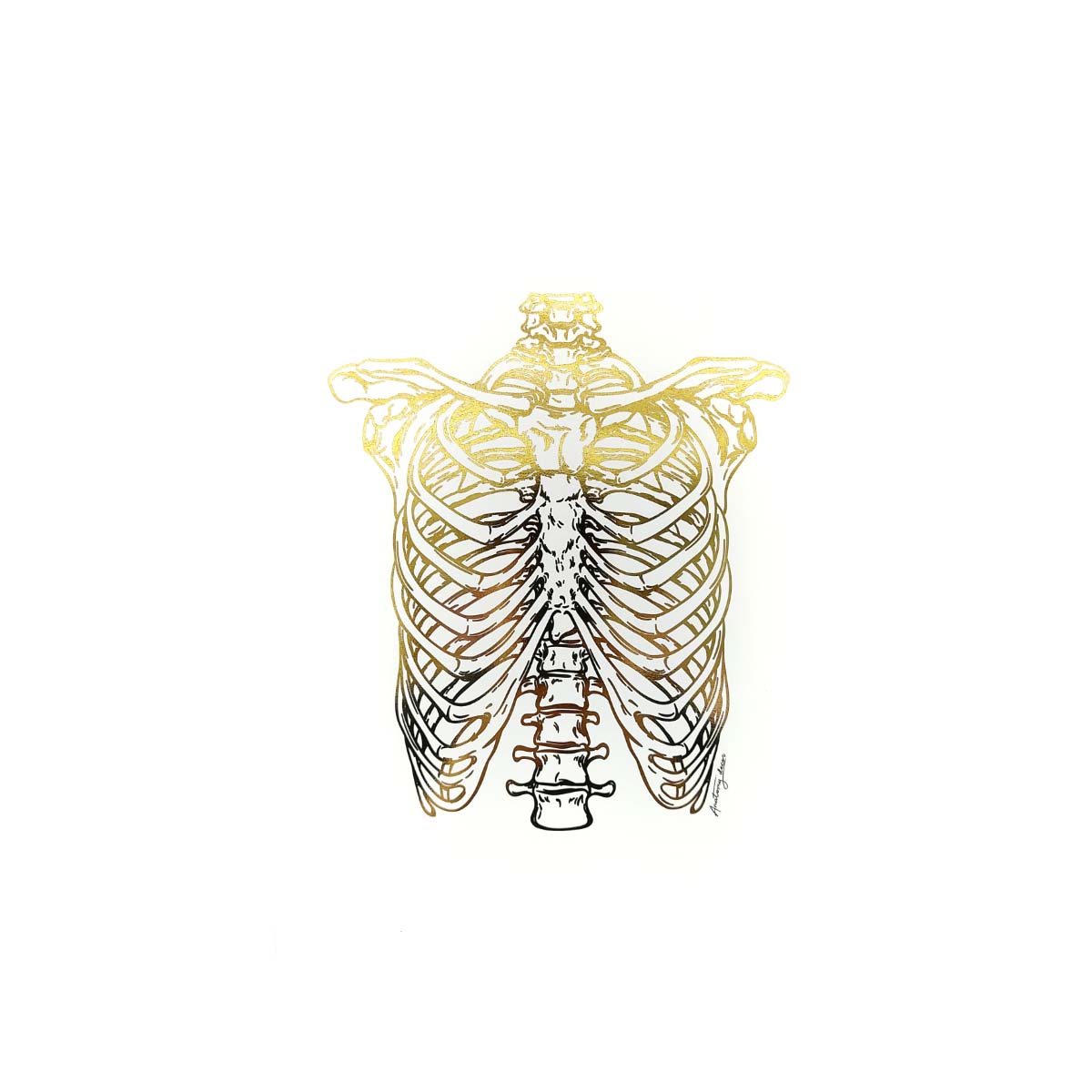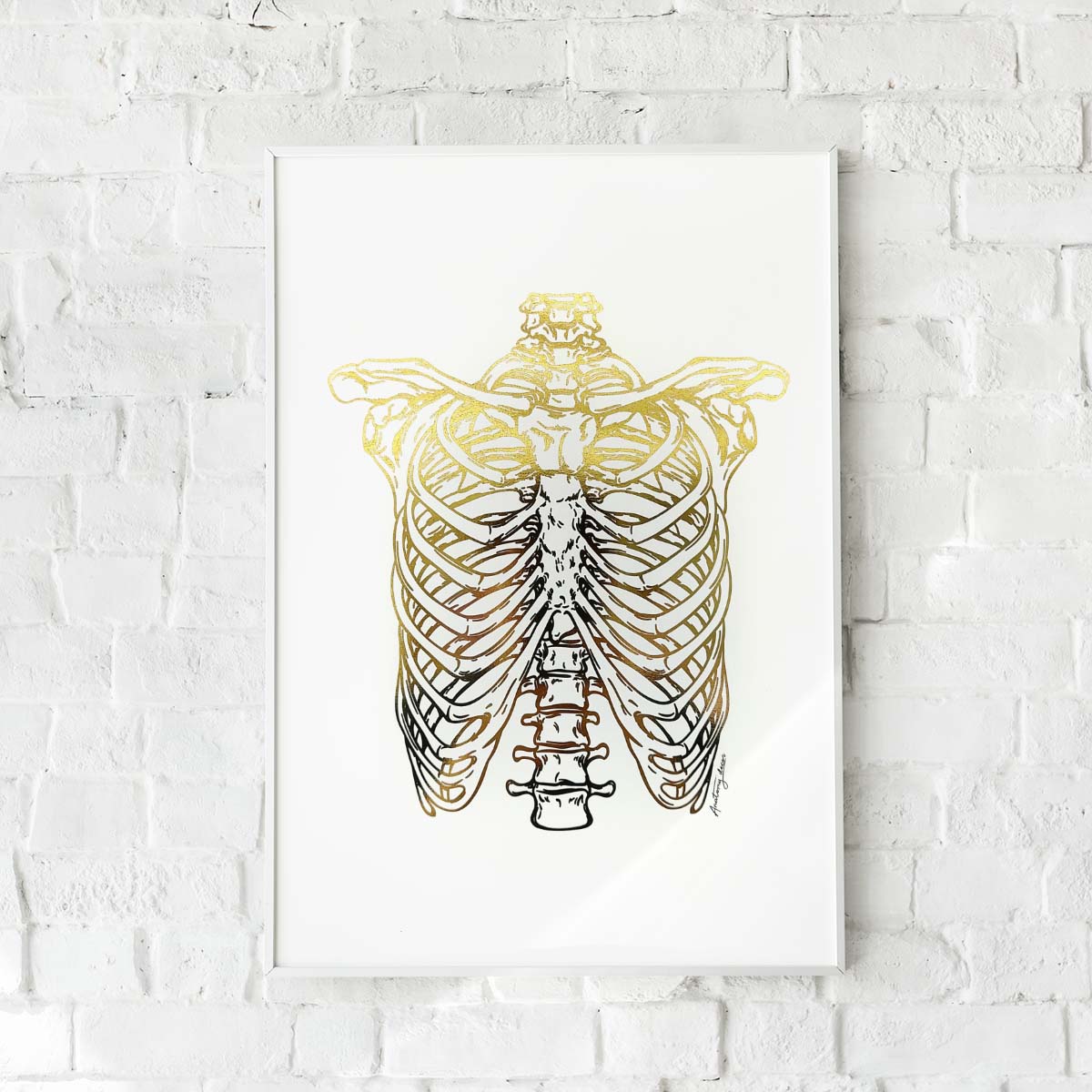 Grafika przedstawia anatomiczną klatkę piersiową pokryty złotą błyszczącą folią. Dzięki zastosowaniu wysokiej klasy materiałów poligraficznych, złocenie doskonale odbija promienie słoneczne tworząc niepowtarzalny efekt. Nasze plakaty to połączeniem anatomii z elegancją, a złoty połysk nadaje pomieszczeniu naturalnego blasku.
