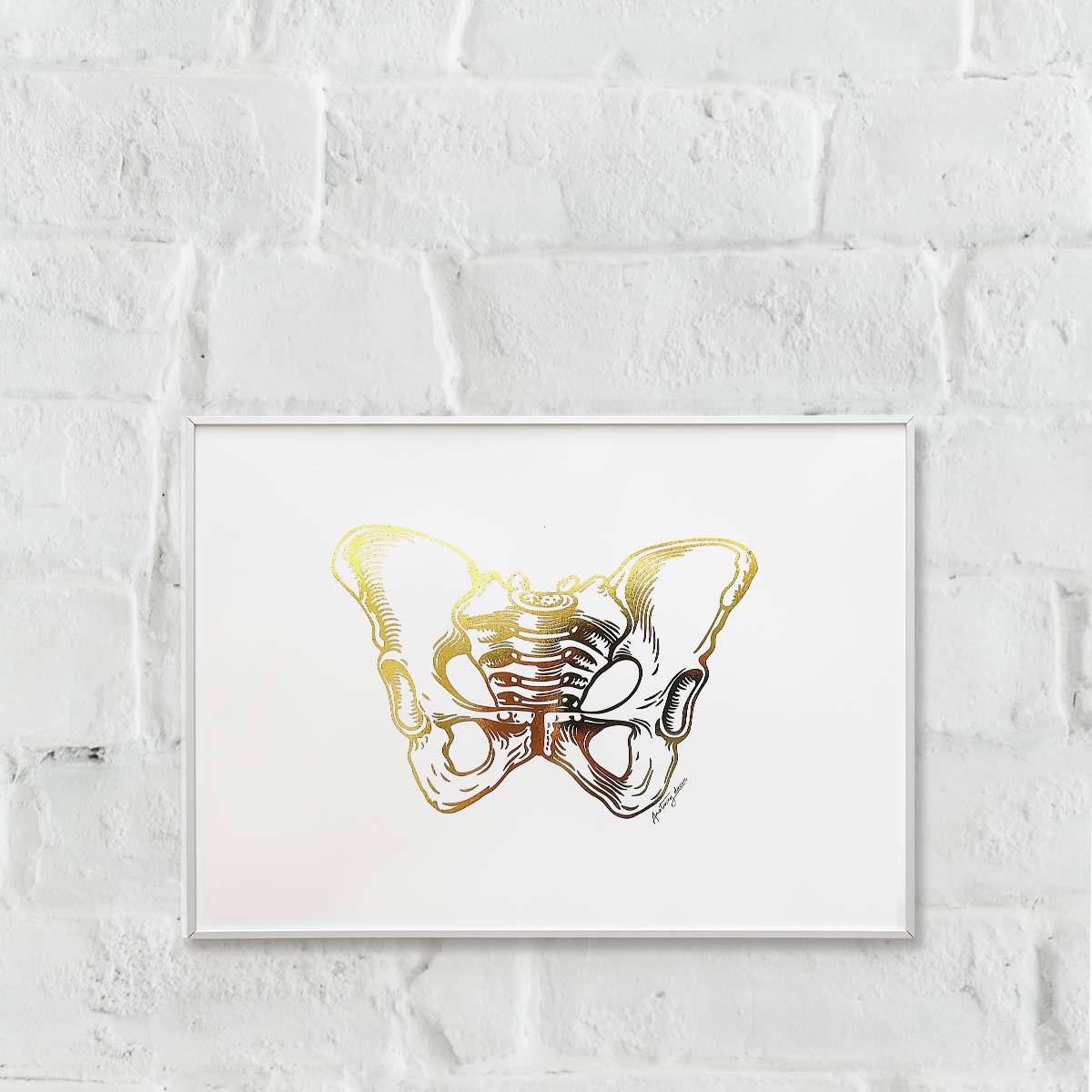 Grafika przedstawia miednicę anatomiczną pokryty złotą błyszczącą folią. Dzięki zastosowaniu wysokiej klasy materiałów poligraficznych, złocenie doskonale odbija promienie słoneczne tworząc niepowtarzalny efekt. Nasze plakaty to połączeniem anatomii z elegancją, a złoty połysk nadaje pomieszczeniu naturalnego blasku.