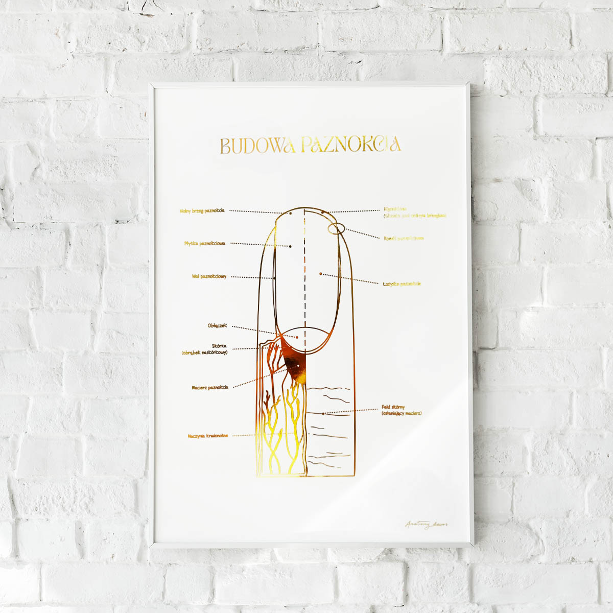Grafika przedstawia budowę paznokcia z podpisami pokrytą złotą błyszczącą folią na białym tle. Dzięki zastosowaniu wysokiej klasy materiałów poligraficznych, złocenie doskonale odbija promienie słoneczne tworząc niepowtarzalny efekt. Nasze plakaty to połączeniem anatomii z elegancją, a złoty połysk nadaje pomieszczeniu naturalnego blasku.