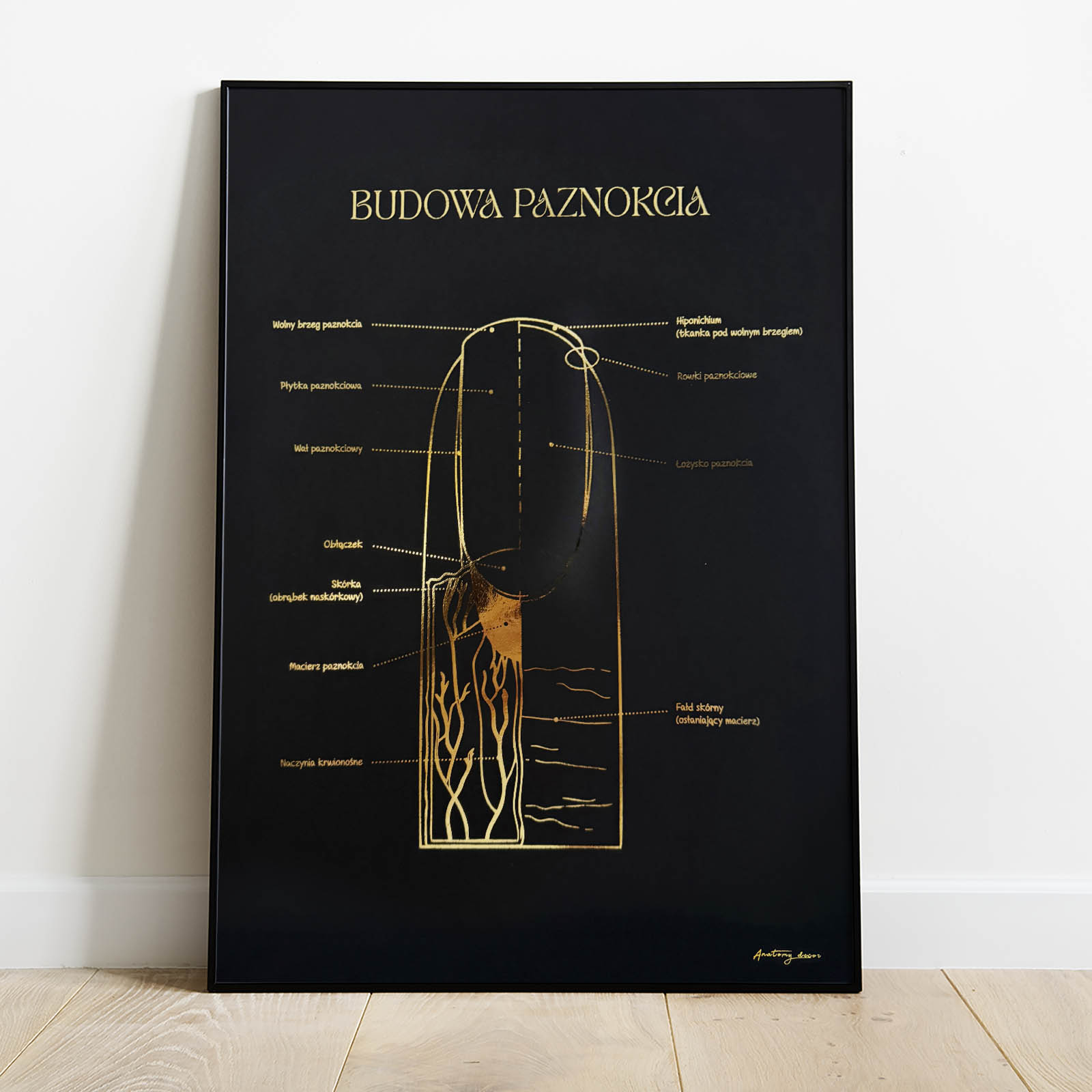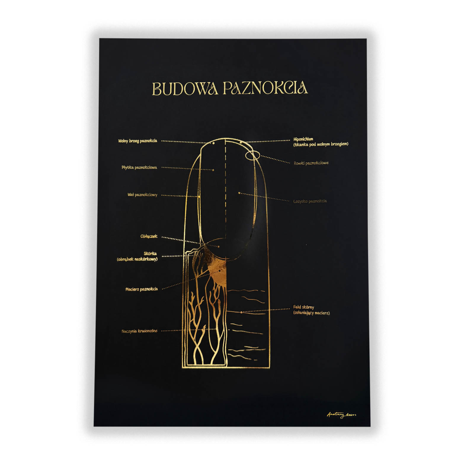 Grafika przedstawia budowę paznokcia z podpisami pokrytą złotą błyszczącą folią na czarnym tle. Dzięki zastosowaniu wysokiej klasy materiałów poligraficznych, złocenie doskonale odbija promienie słoneczne tworząc niepowtarzalny efekt. Nasze plakaty to połączeniem anatomii z elegancją, a złoty połysk nadaje pomieszczeniu naturalnego blasku.