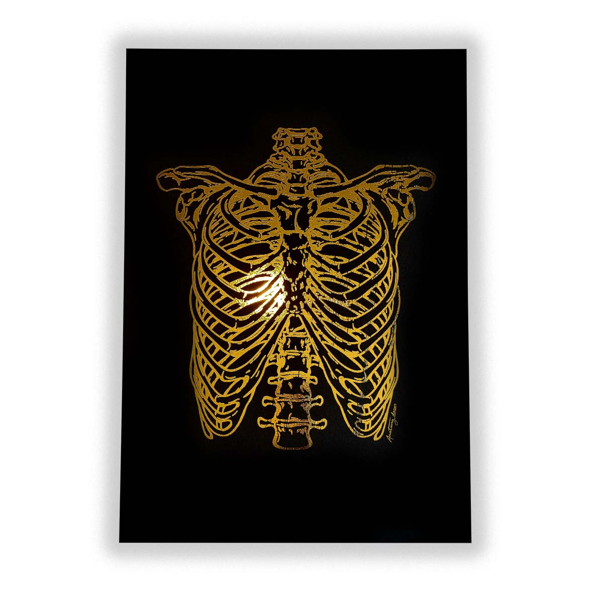 Grafika przedstawia klatkę piersiową na czarnym tle pokrytą złotą błyszczącą folią. Dzięki zastosowaniu wysokiej klasy materiałów poligraficznych, złocenie doskonale odbija promienie słoneczne tworząc niepowtarzalny efekt. Nasze plakaty to połączeniem anatomii z elegancją, a złoty połysk nadaje pomieszczeniu naturalnego blasku.