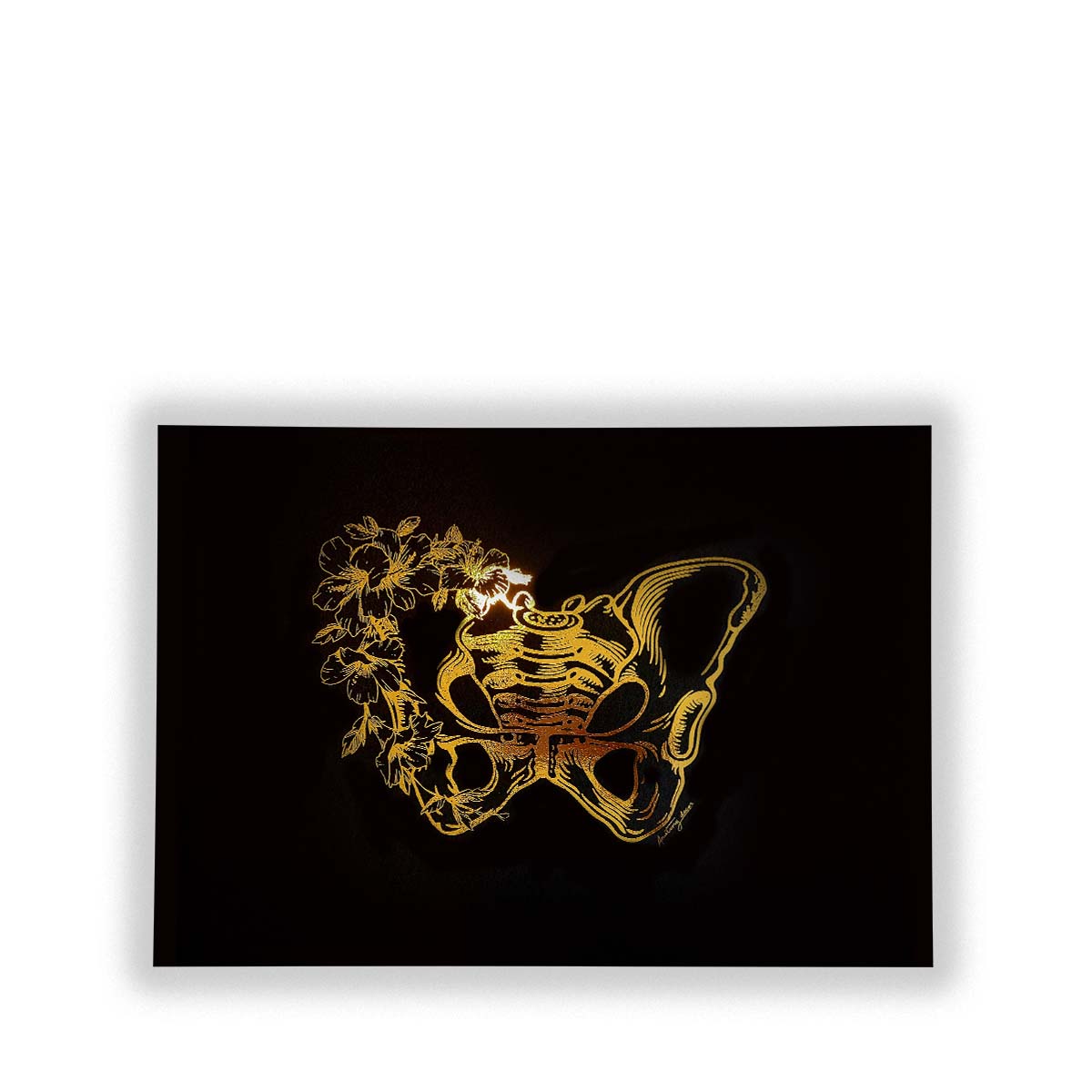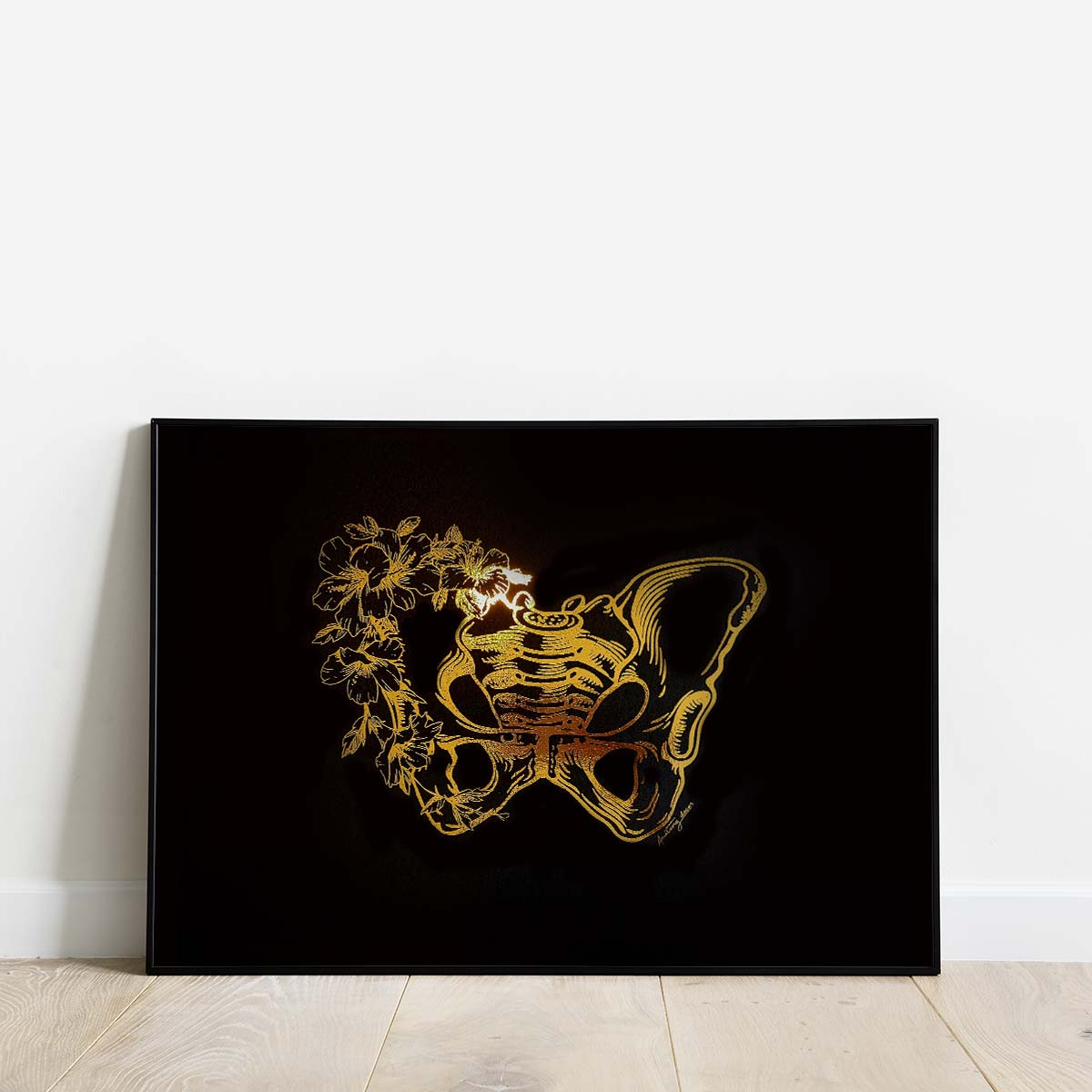 Grafika przedstawia rysunek miednicy z kwiatami na czarnym tle pokrytego złotą błyszczącą folią. Dzięki zastosowaniu wysokiej klasy materiałów poligraficznych, złocenie doskonale odbija promienie słoneczne tworząc niepowtarzalny efekt. Nasze plakaty to połączeniem anatomii z elegancją, a złoty połysk nadaje pomieszczeniu naturalnego blasku.
