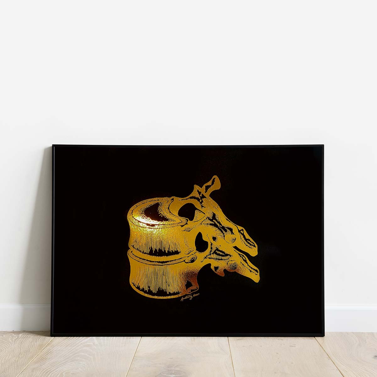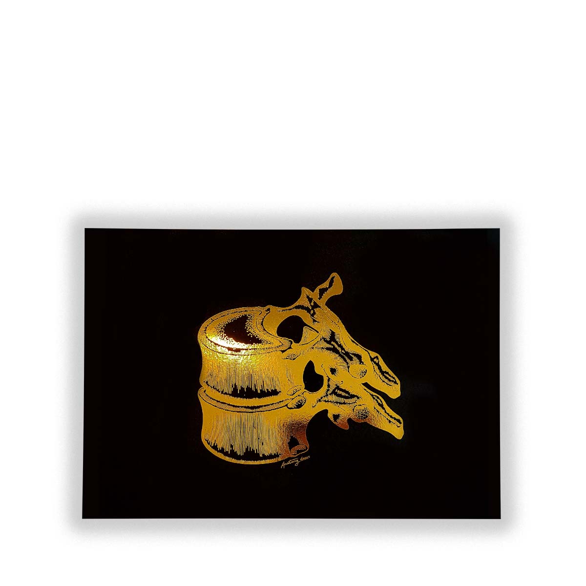 Grafika przedstawia rysunek kręgów na czarnym tle pokrytego złotą błyszczącą folią. Dzięki zastosowaniu wysokiej klasy materiałów poligraficznych, złocenie doskonale odbija promienie słoneczne tworząc niepowtarzalny efekt. Nasze plakaty to połączeniem anatomii z elegancją, a złoty połysk nadaje pomieszczeniu naturalnego blasku.