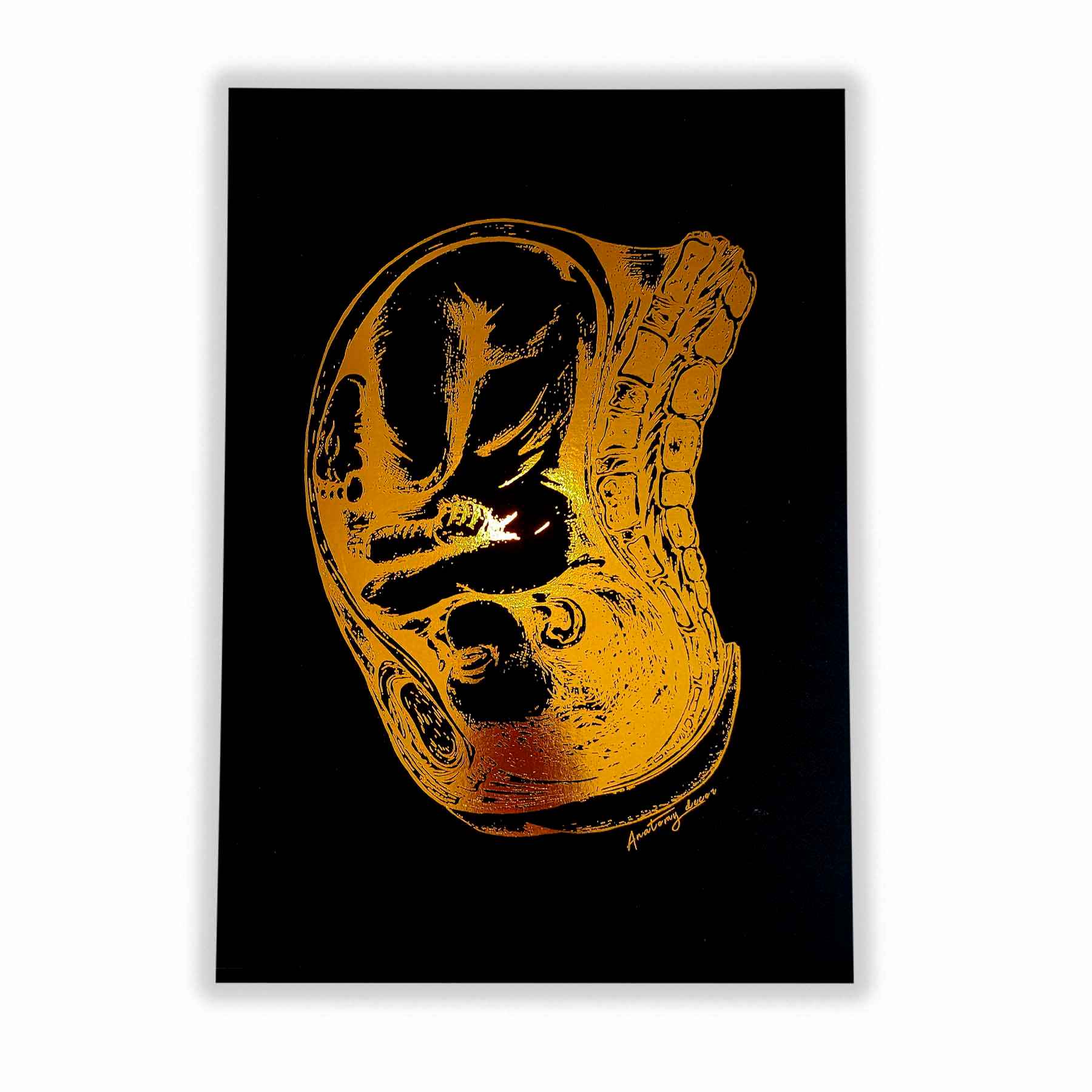 Grafika przedstawia płód na czarnym tle pokryty złotą błyszczącą folią. Dzięki zastosowaniu wysokiej klasy materiałów poligraficznych, złocenie doskonale odbija promienie słoneczne tworząc niepowtarzalny efekt. Nasze plakaty to połączeniem anatomii z elegancją, a złoty połysk nadaje pomieszczeniu naturalnego blasku.