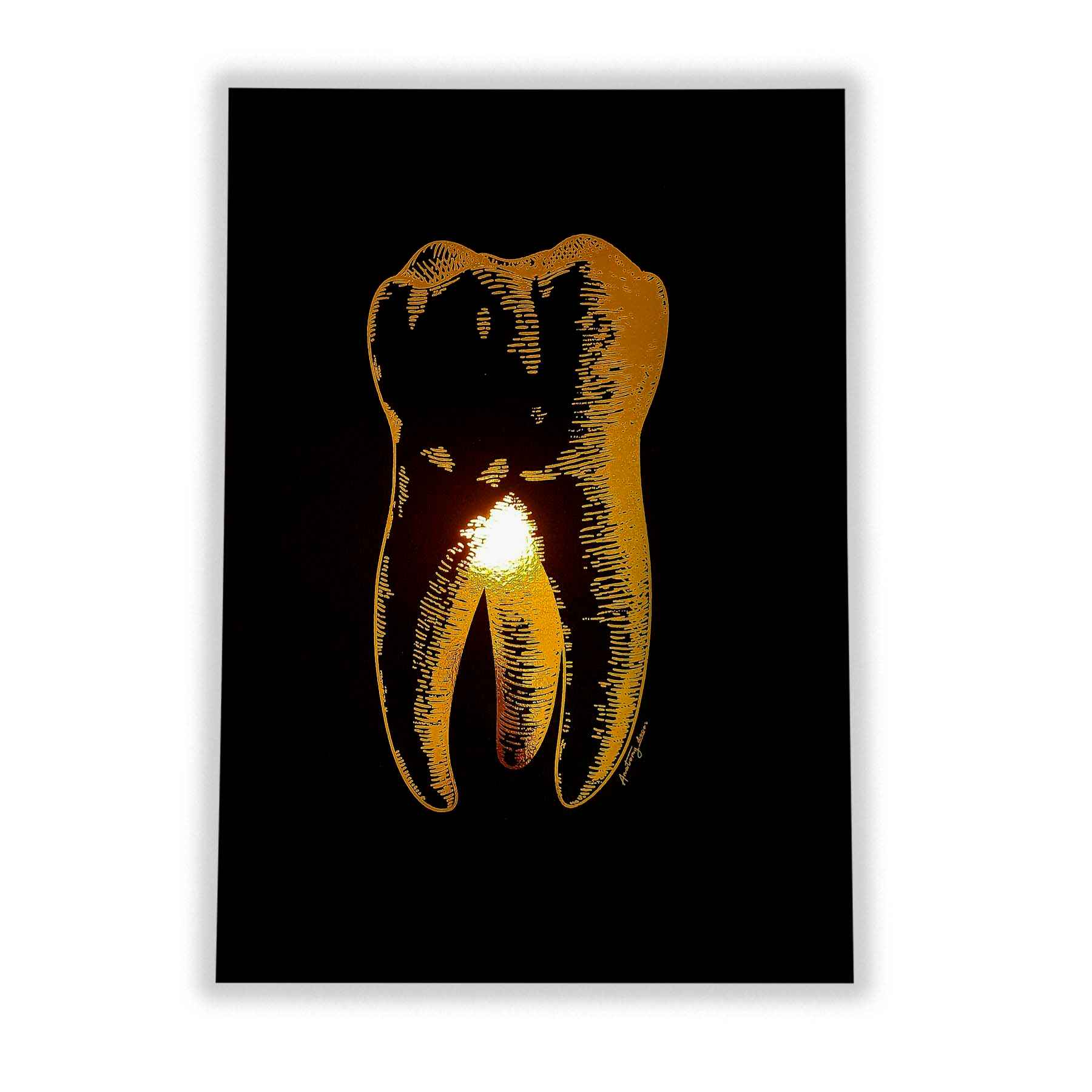 Grafika przedstawia złotego zęba na czarnym tle pokrytego złotą błyszczącą folią. Dzięki zastosowaniu wysokiej klasy materiałów poligraficznych, złocenie doskonale odbija promienie słoneczne tworząc niepowtarzalny efekt. Nasze plakaty to połączeniem anatomii z elegancją, a złoty połysk nadaje pomieszczeniu naturalnego blasku.