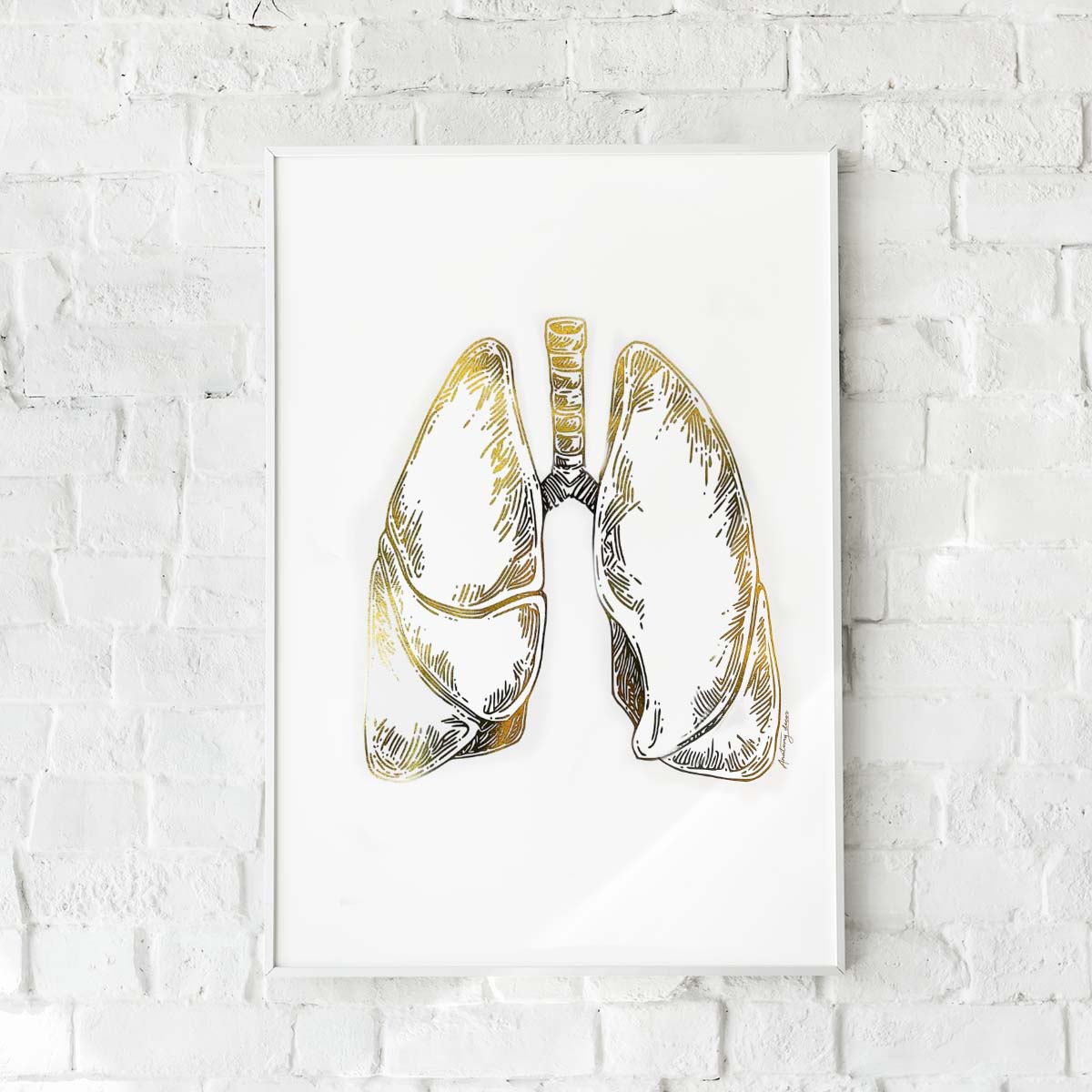 Grafika przedstawia płuca anatomiczne pokryte złotą błyszczącą folią. Dzięki zastosowaniu wysokiej klasy materiałów poligraficznych, złocenie doskonale odbija promienie słoneczne tworząc niepowtarzalny efekt. Nasze plakaty to połączeniem anatomii z elegancją, a złoty połysk nadaje pomieszczeniu naturalnego blasku.