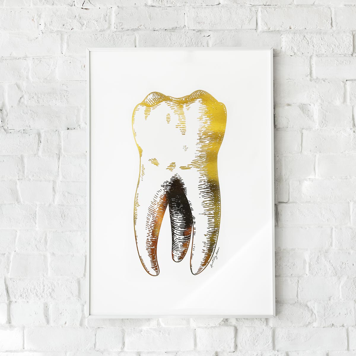 Grafika przedstawia ząb anatomiczny pokryty złotą błyszczącą folią. Dzięki zastosowaniu wysokiej klasy materiałów poligraficznych, złocenie doskonale odbija promienie słoneczne tworząc niepowtarzalny efekt. Nasze plakaty to połączeniem anatomii z elegancją, a złoty połysk nadaje pomieszczeniu naturalnego blasku.