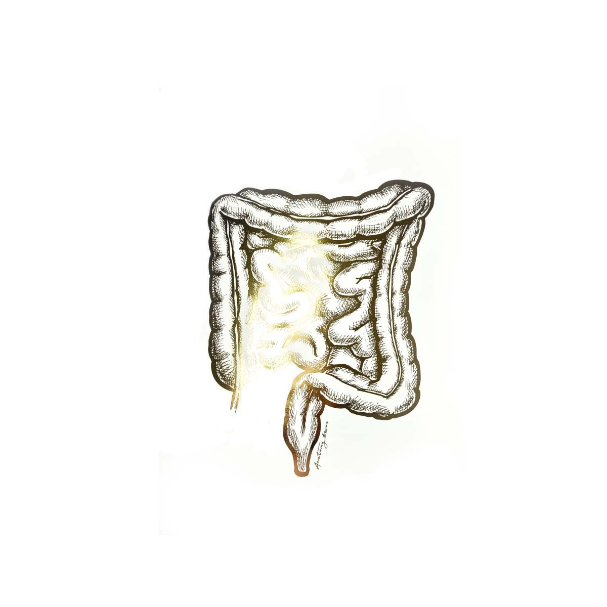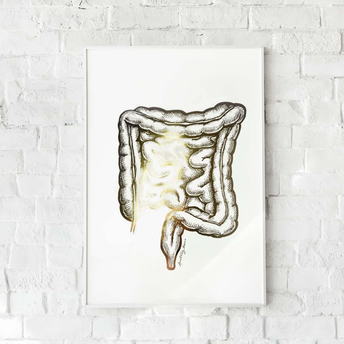 Grafika przedstawia jelita anatomiczne pokryte złotą błyszczącą folią. Dzięki zastosowaniu wysokiej klasy materiałów poligraficznych, złocenie doskonale odbija promienie słoneczne tworząc niepowtarzalny efekt. Nasze plakaty to połączeniem anatomii z elegancją, a złoty połysk nadaje pomieszczeniu naturalnego blasku.